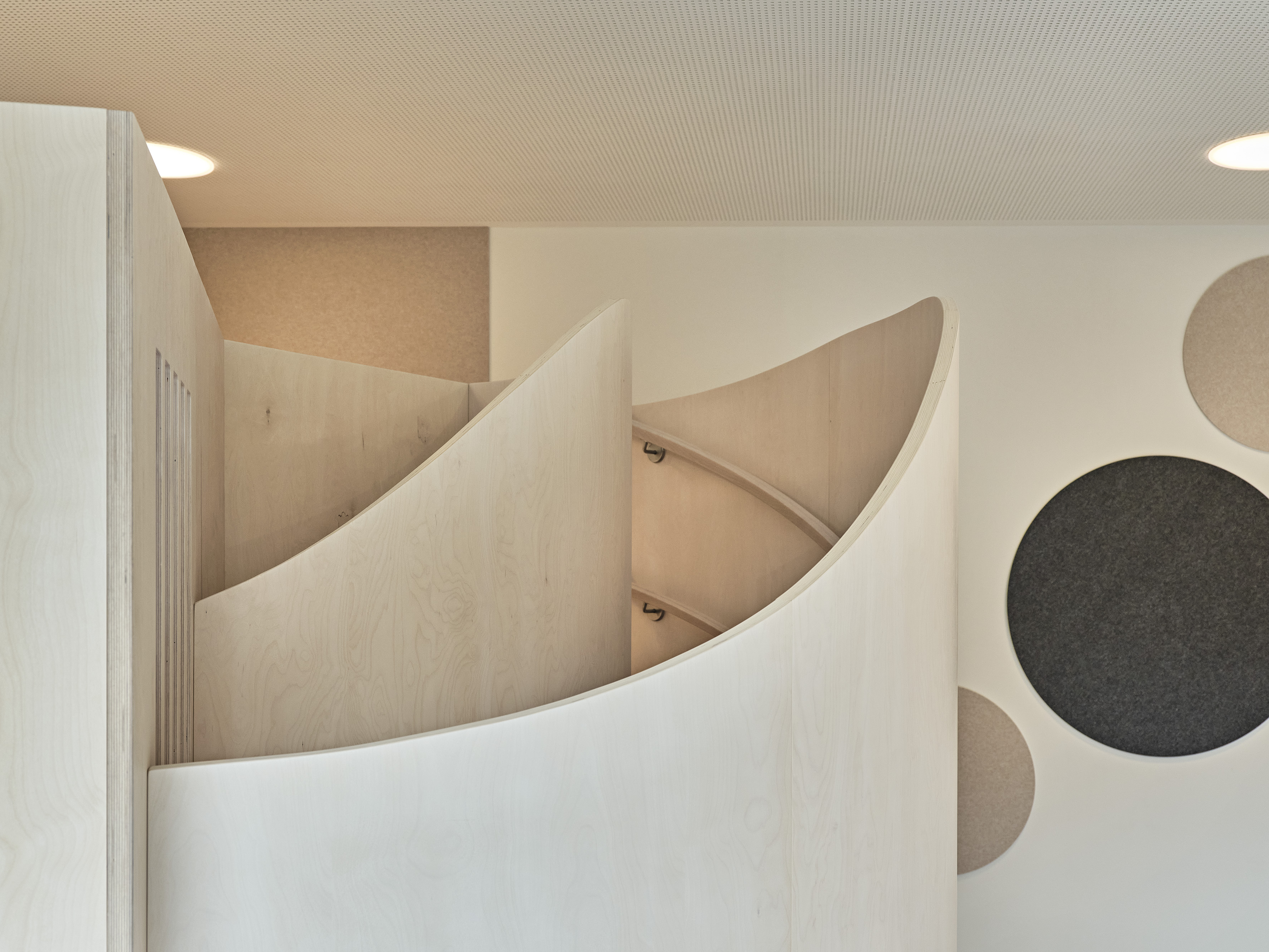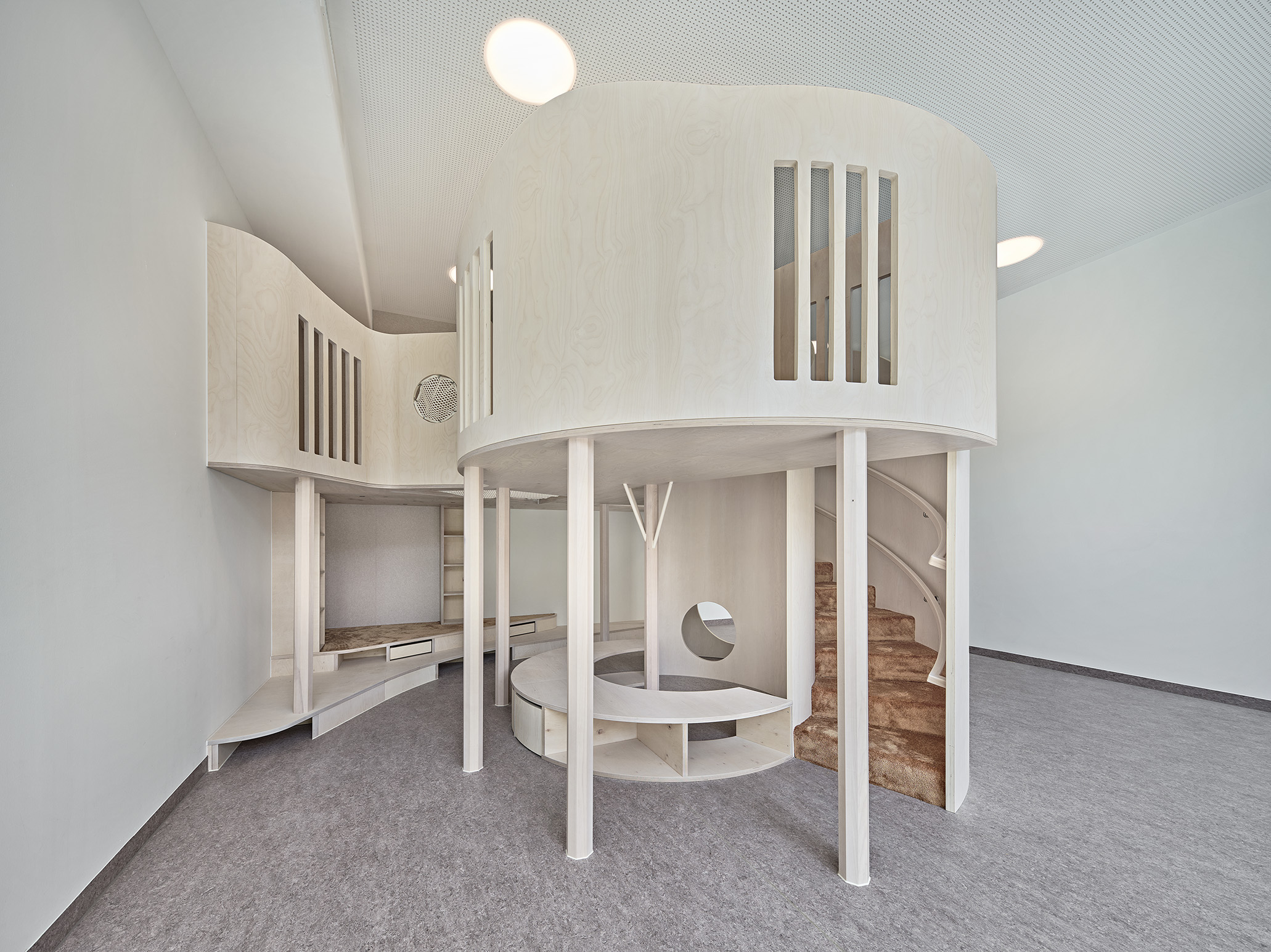Die neu geschaffene Kita bietet eine abwechslungsreiche und sichere Umgebung mit viel Platz zum Spielen und Lernen. Besondere Merkmale sind maßgefertigte, doppelstöckige Holzeinbauten, die an die jeweilige Raumgröße angepasst sind und die Bewegungsfreude der Kinder fördern sollen, sowie unterschiedliche Zonierungen innerhalb der Räume, für Entdeckungstouren und Rückzugsmöglichkeiten
