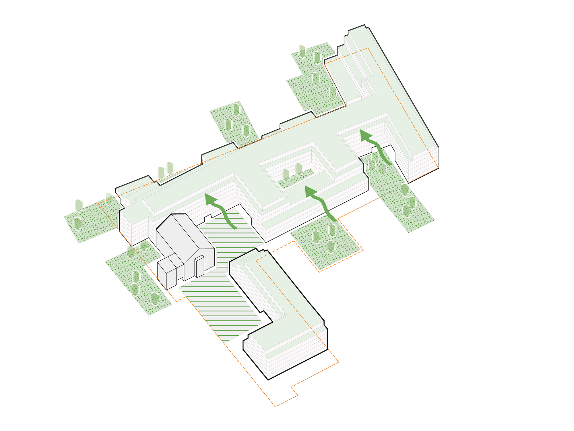 Im Erdgeschoss erlauben Durchgänge die Durchwegung des Quartiers und schaffen private Höfe für die Anwohner. Durch die Terrassenausbildung werden die neu geschaffenen Grünflächen stufenweise auf das Dach geführt und erhöhen damit maßgeblich den Grünraumanteil des Gevierts.