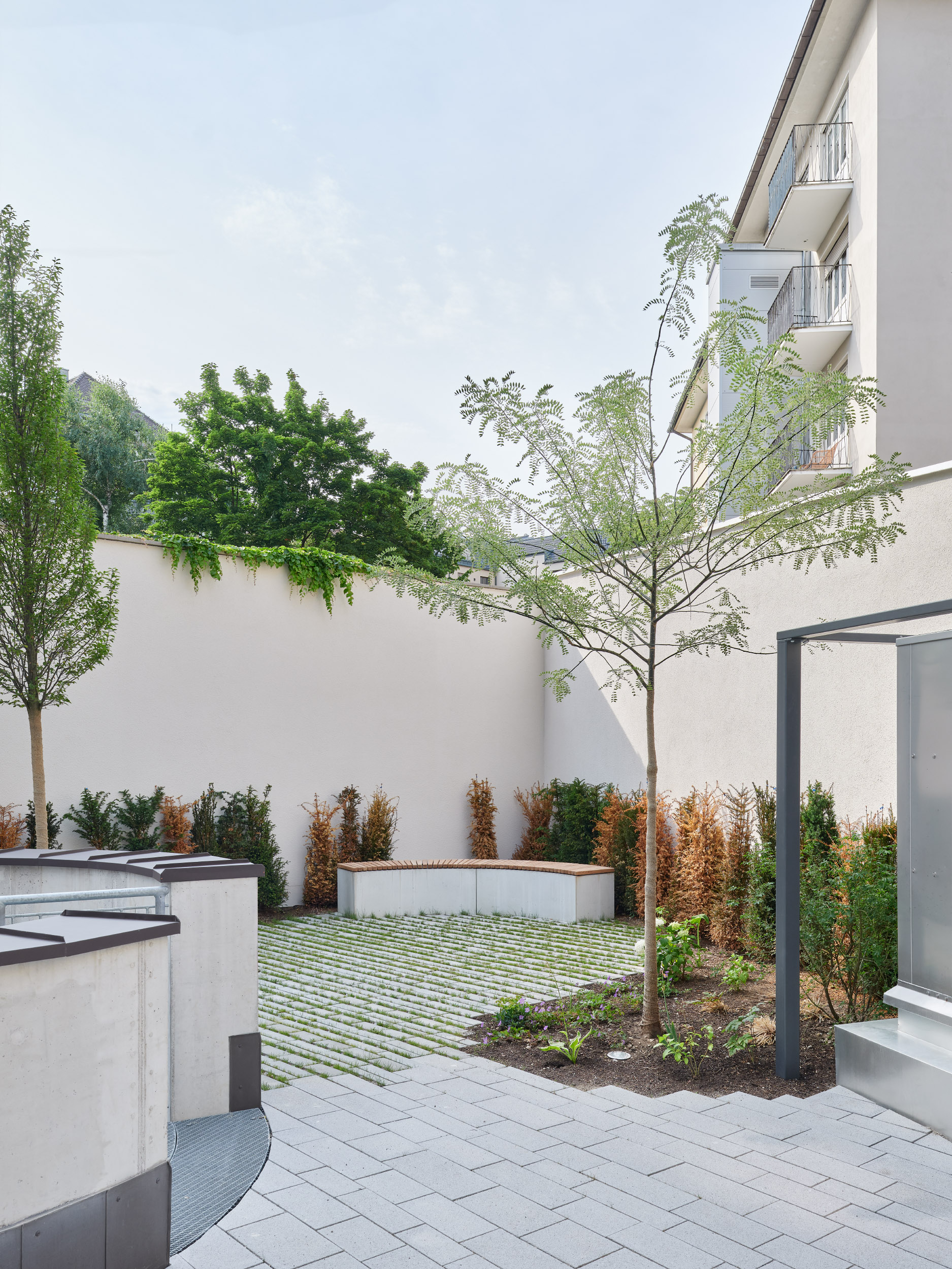 Der private Gartenbereich auf der Rückseite nimmt die Gestaltung der angrenzenden Gärten auf und fügt sich stimmig in das gewachsene Umfeld der Ludwigsvorstadt ein. Pergolen, Pflanzflächen und Sitznischen schaffen Aufenthaltsqualität und einen nutzbaren Außenraum im Arbeitsalltag. Die sorgfältige Freiraumgestaltung ergänzt den architektonischen Anspruch des Gebäudes und stärkt dessen Einbindung ins Quartier