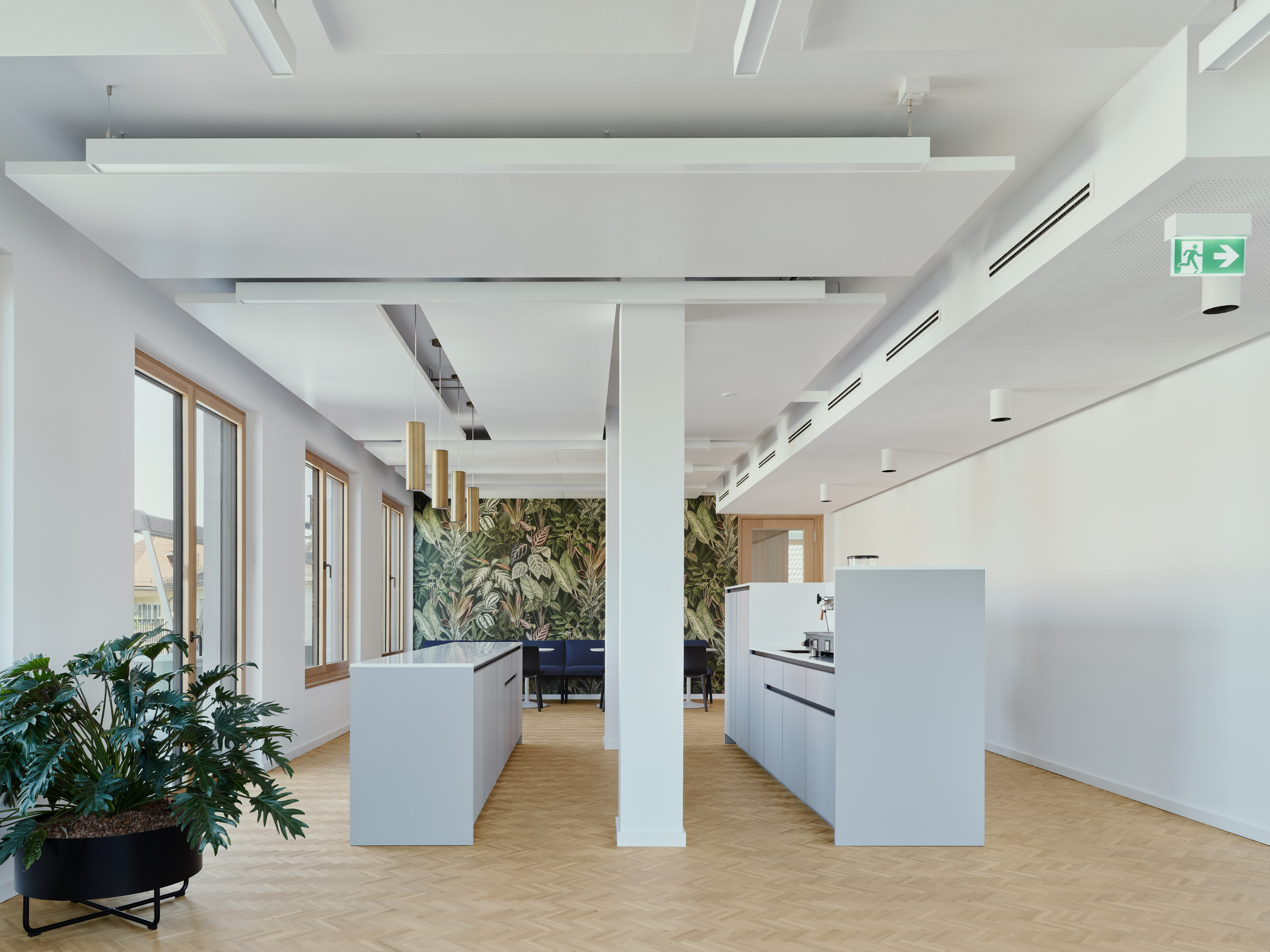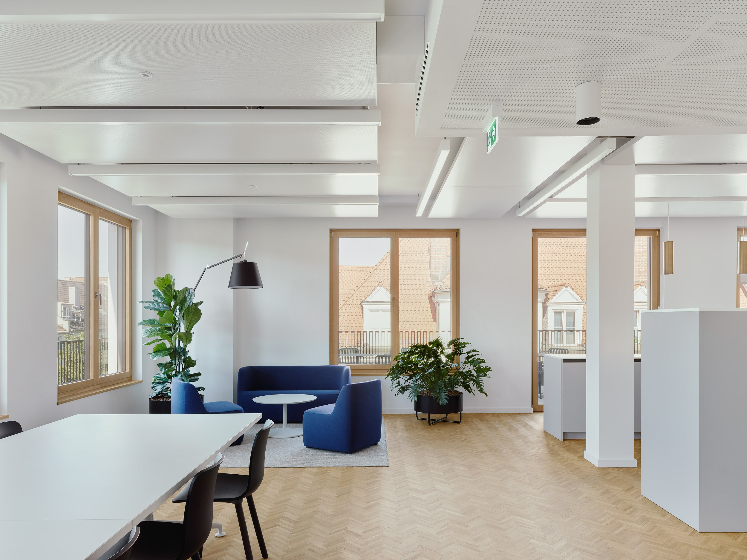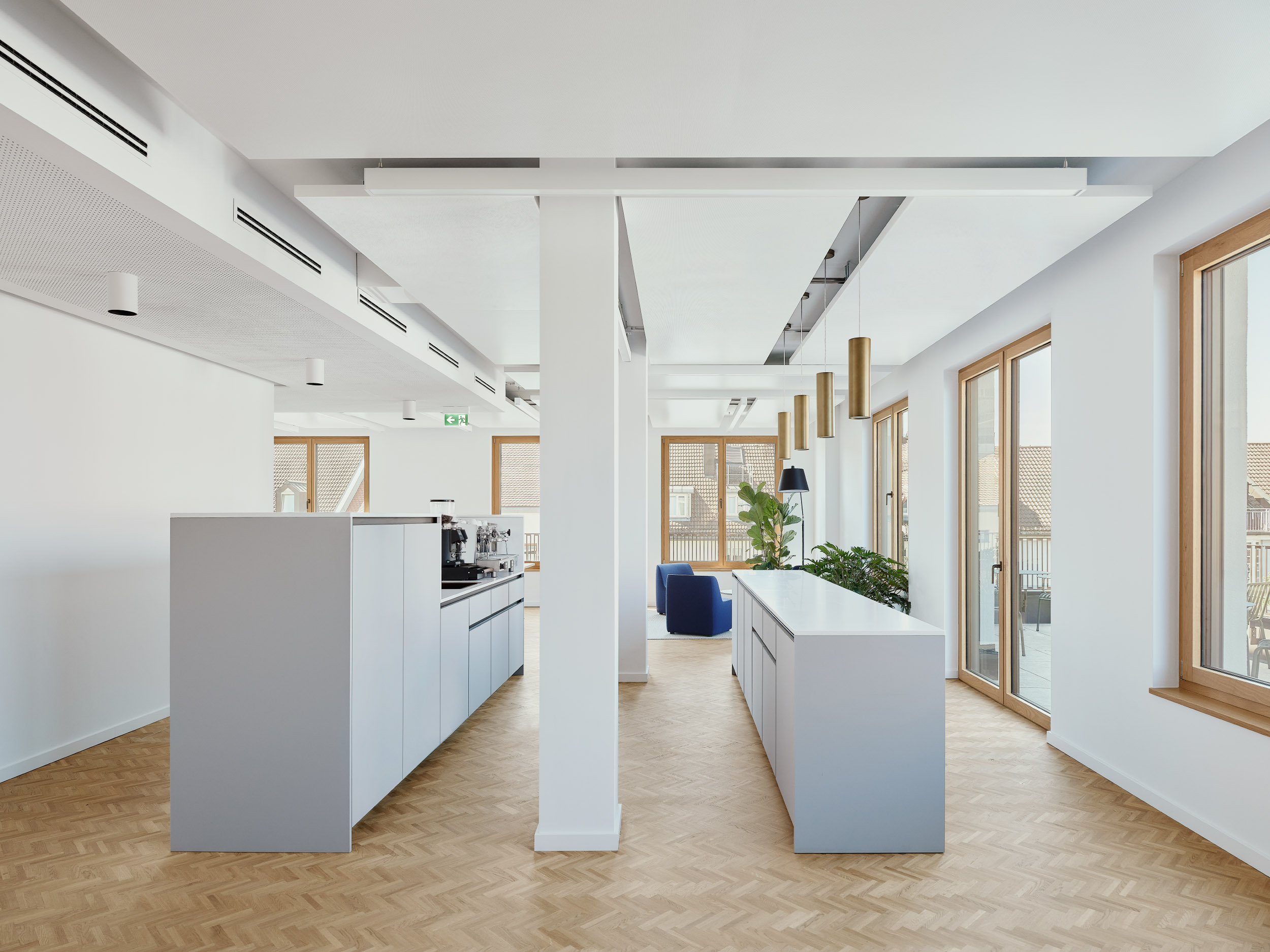 Die Grundrisse der Obergeschosse ermöglichen unterschiedlichste Büroeinheiten und Zonierungen – von Einzelbüros über helle Besprechungsräume bis hin zu offenen Aufenthaltsbereichen auf verschiedenen Geschossen. Auf jeder Etage steht eine Teeküche zur Verfügung, im vierten Obergeschoss zusätzlich eine großzügige Gemeinschaftsküche mit hochwertiger Ausstattung.