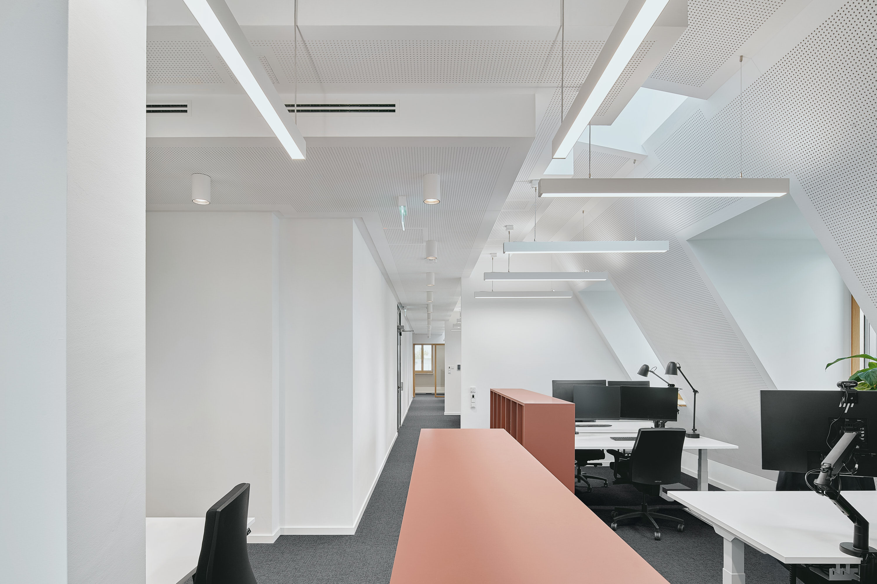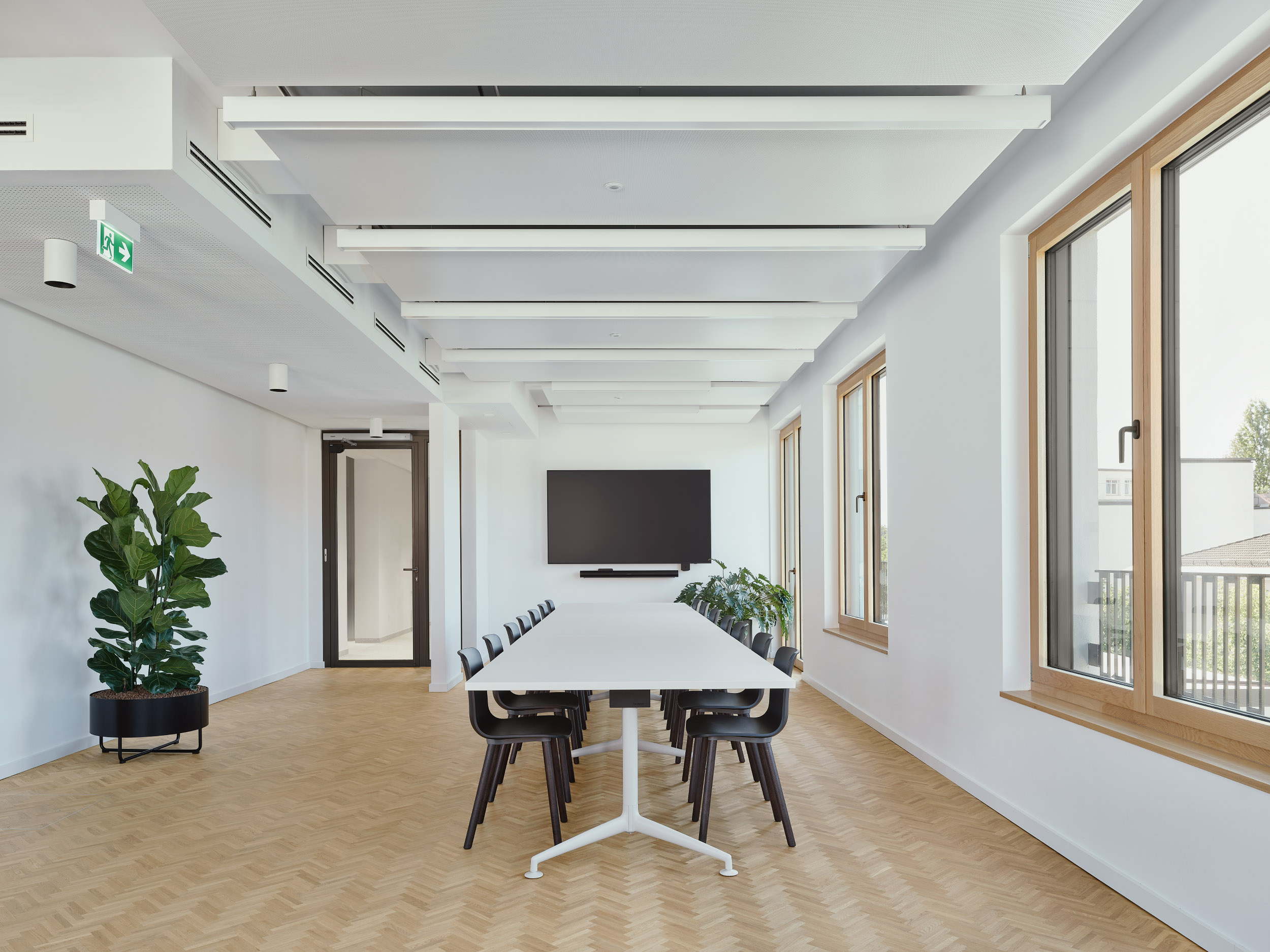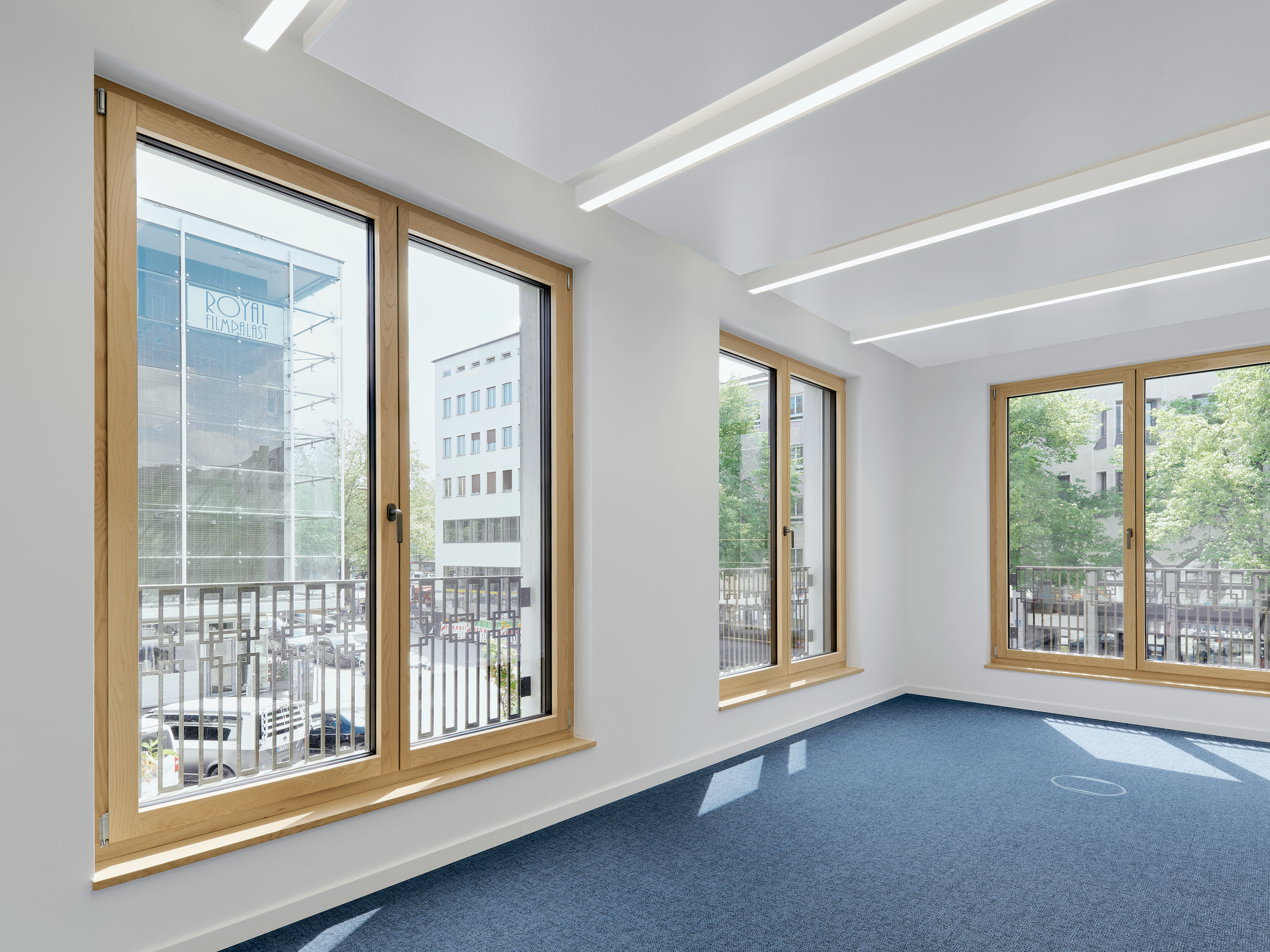 Die Grundrisse der Obergeschosse ermöglichen unterschiedlichste Büroeinheiten und Zonierungen – von Einzelbüros über helle Besprechungsräume bis hin zu offenen Aufenthaltsbereichen auf verschiedenen Geschossen. Auf jeder Etage steht eine Teeküche zur Verfügung, im vierten Obergeschoss zusätzlich eine großzügige Gemeinschaftsküche mit hochwertiger Ausstattung.