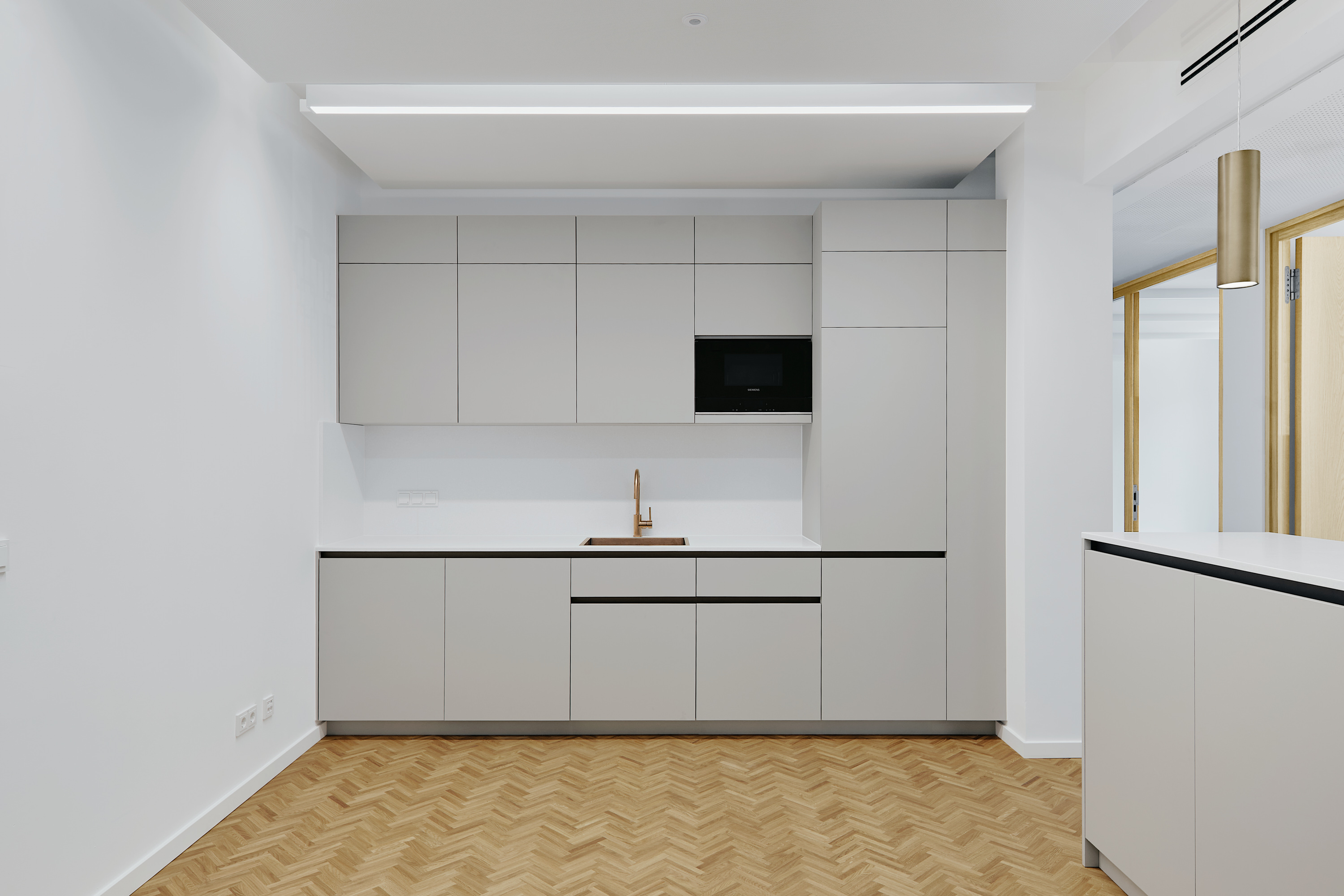 Bei den Materialien dominieren langlebige, zurückhaltend gestaltete Oberflächen: mineralischer Werkstein in den Küchen sowie Holz-Aluminium-Fensterelemente mit tiefen Laibungen prägen das Interieur. Balkone auf allen Etagen sowie zwei Dachterrassen im obersten Geschoss erweitern die Nutzbarkeit in den Außenraum.