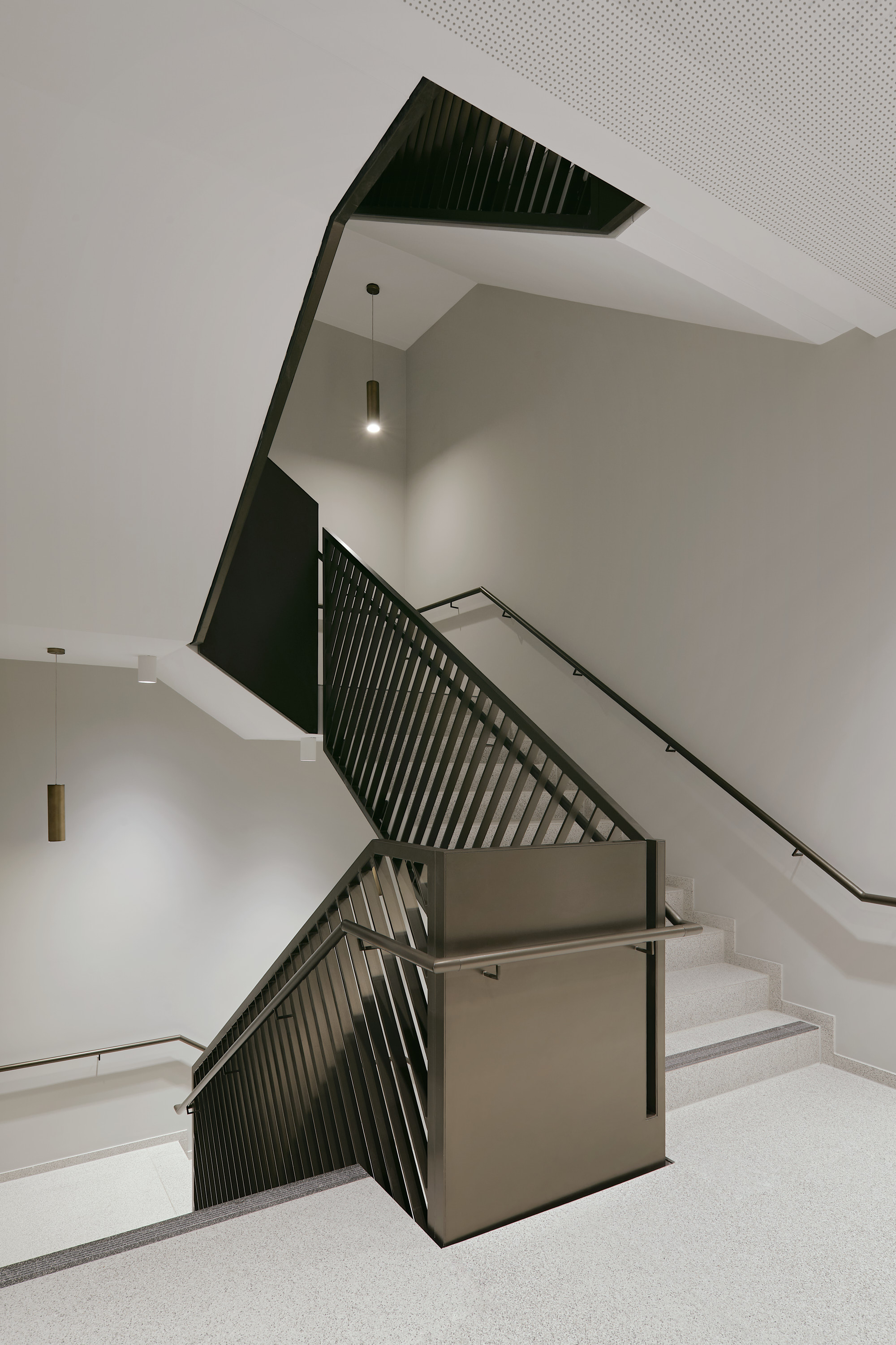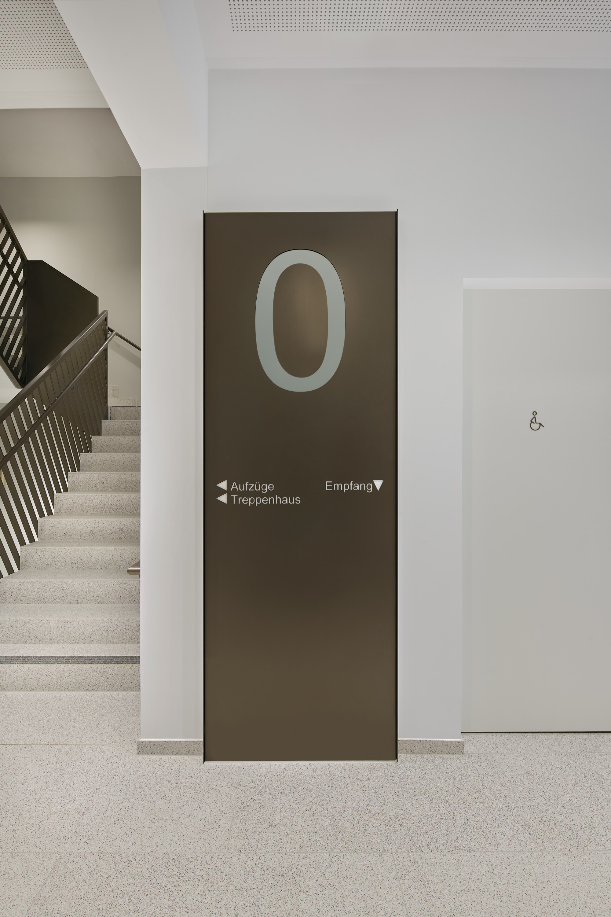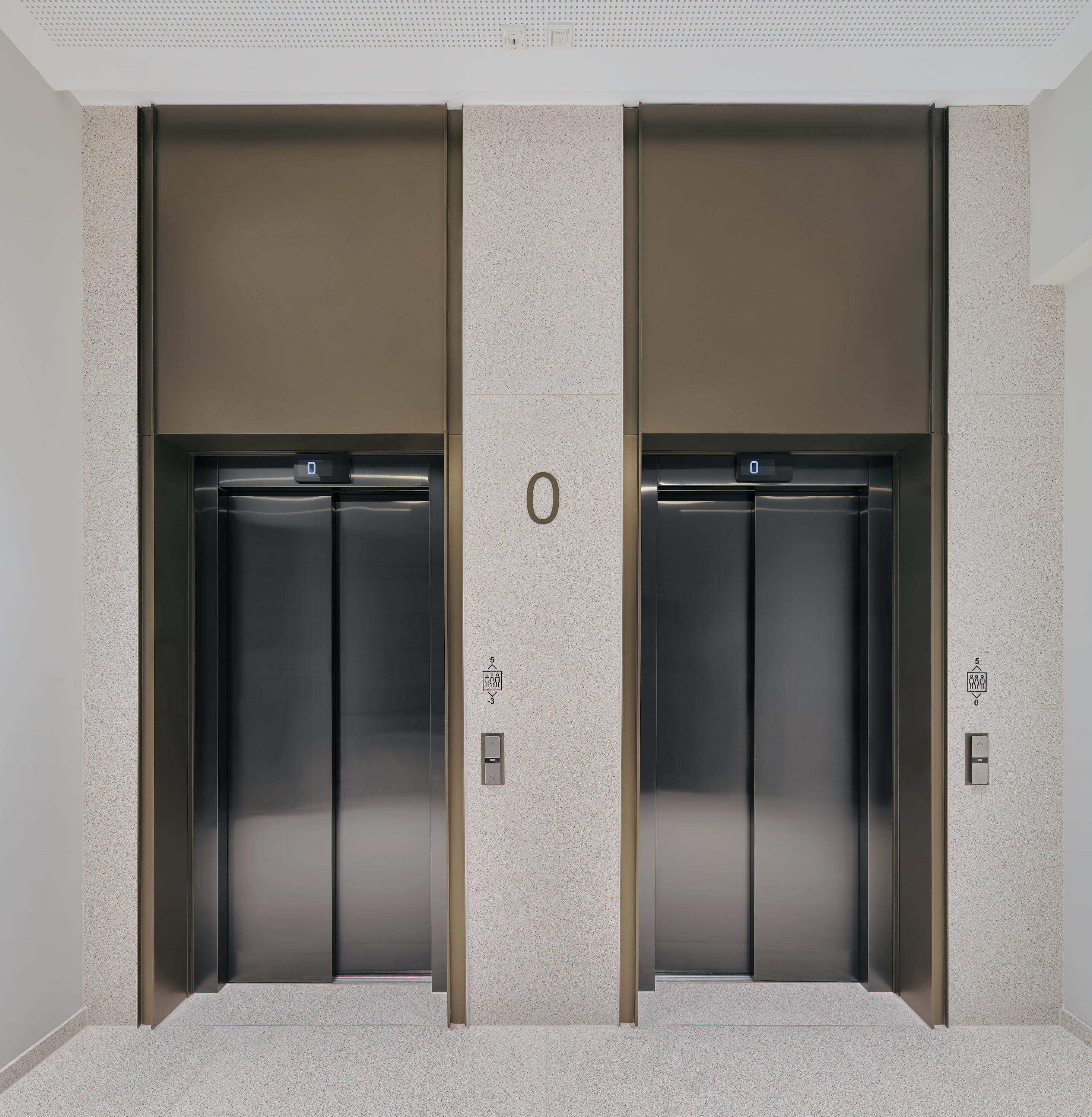 Ein zentral gelegener, hochwertig gestalteter Treppen- und Aufzugskern erschließt das Gebäude und verbindet alle Ebenen über zwei Personenaufzüge sowie eine offen geführte Treppe. Die Technikflächen sind im ersten Untergeschoss untergebracht; die beiden darunterliegenden Tiefgaragenebenen werden über einen PKW-Aufzug erschlossen.