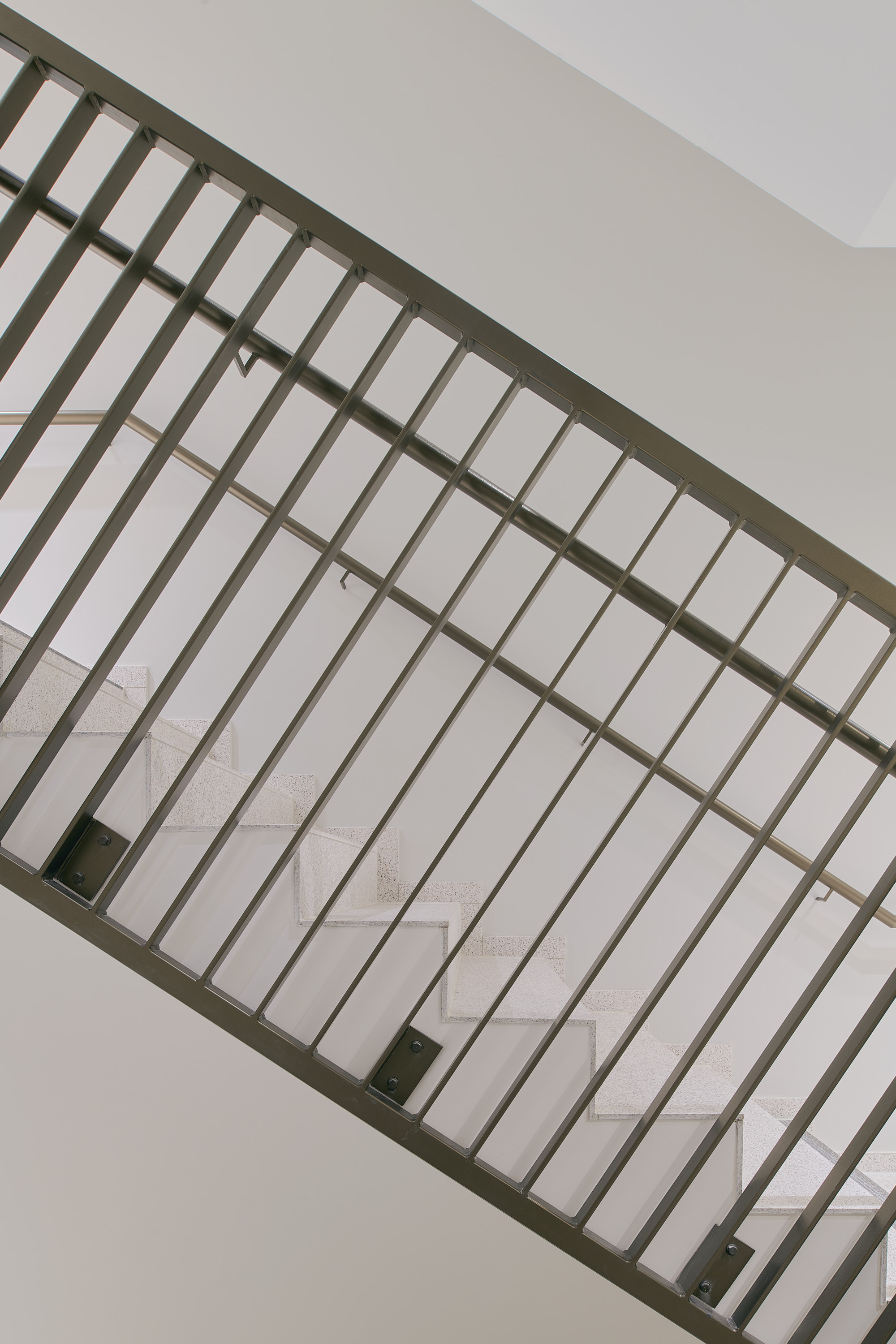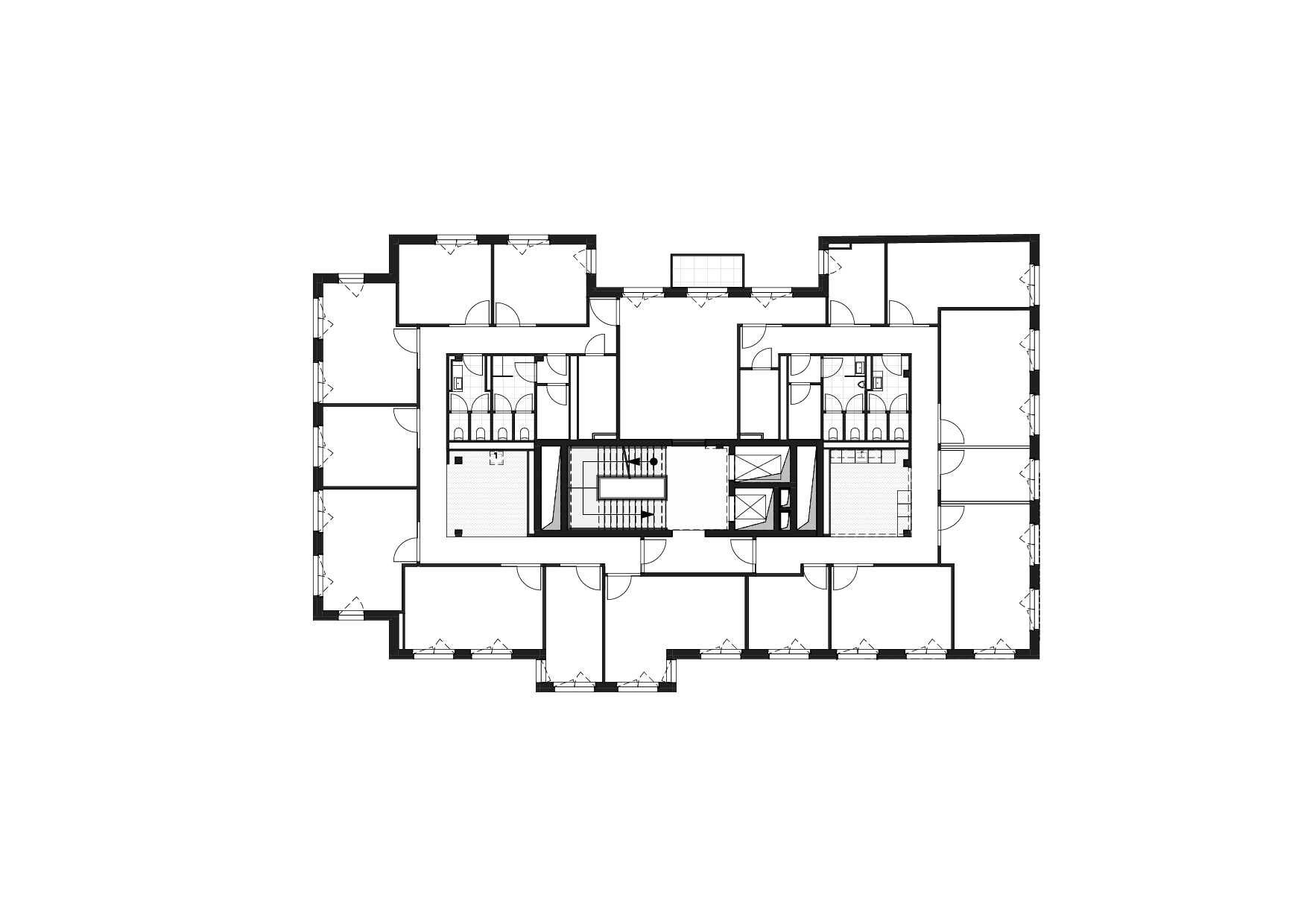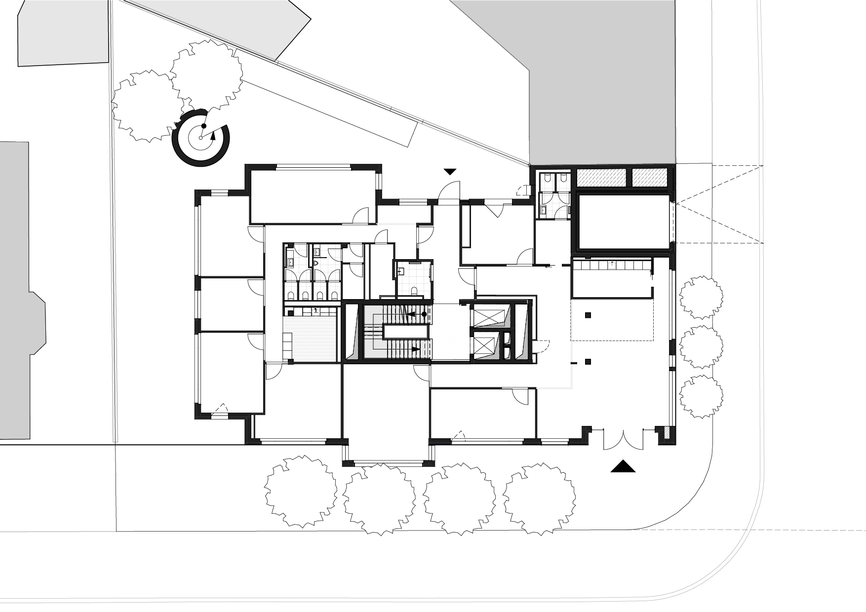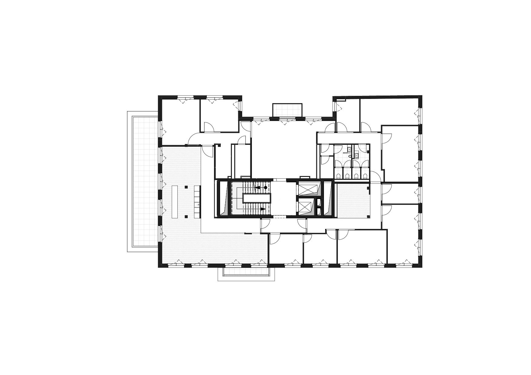 Ein zentral gelegener, hochwertig gestalteter Treppen- und Aufzugskern erschließt das Gebäude und verbindet alle Ebenen über zwei Personenaufzüge sowie eine offen geführte Treppe. Die Technikflächen sind im ersten Untergeschoss untergebracht; die beiden darunterliegenden Tiefgaragenebenen werden über einen PKW-Aufzug erschlossen.
