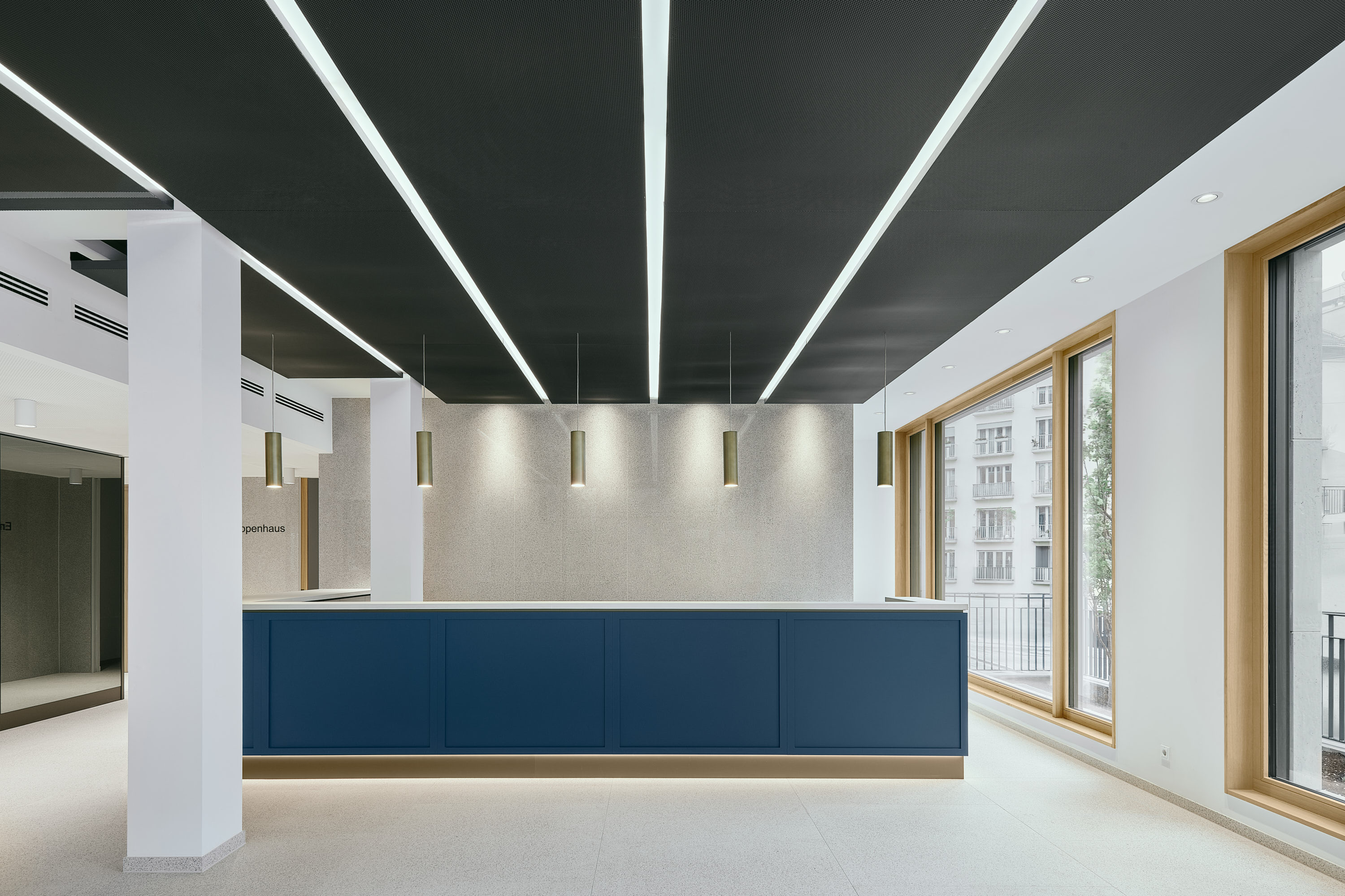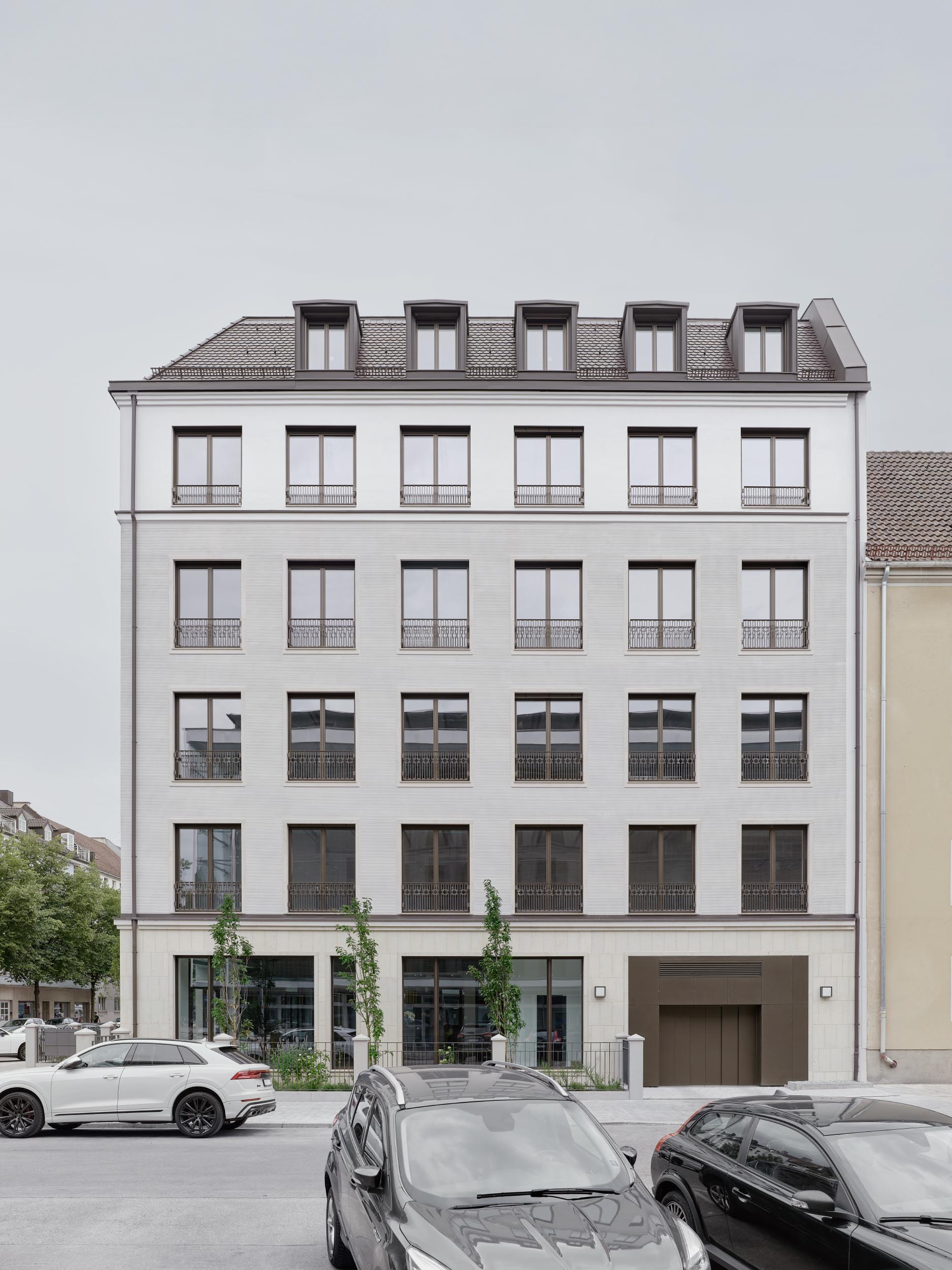 Natursteinfaschen fassen die Fenster ein, gliedern die Fassade rhythmisch und greifen gestalterische Elemente der historischen Bebauung des frühen 20. Jahrhunderts am Standort auf. Das neue Bürogebäude reminisziert in seiner Gestaltung an das historisch gewachsene Wiesn-Ensemble und setzt bewusst auf klassische Proportionen und handwerkliche Präzision.