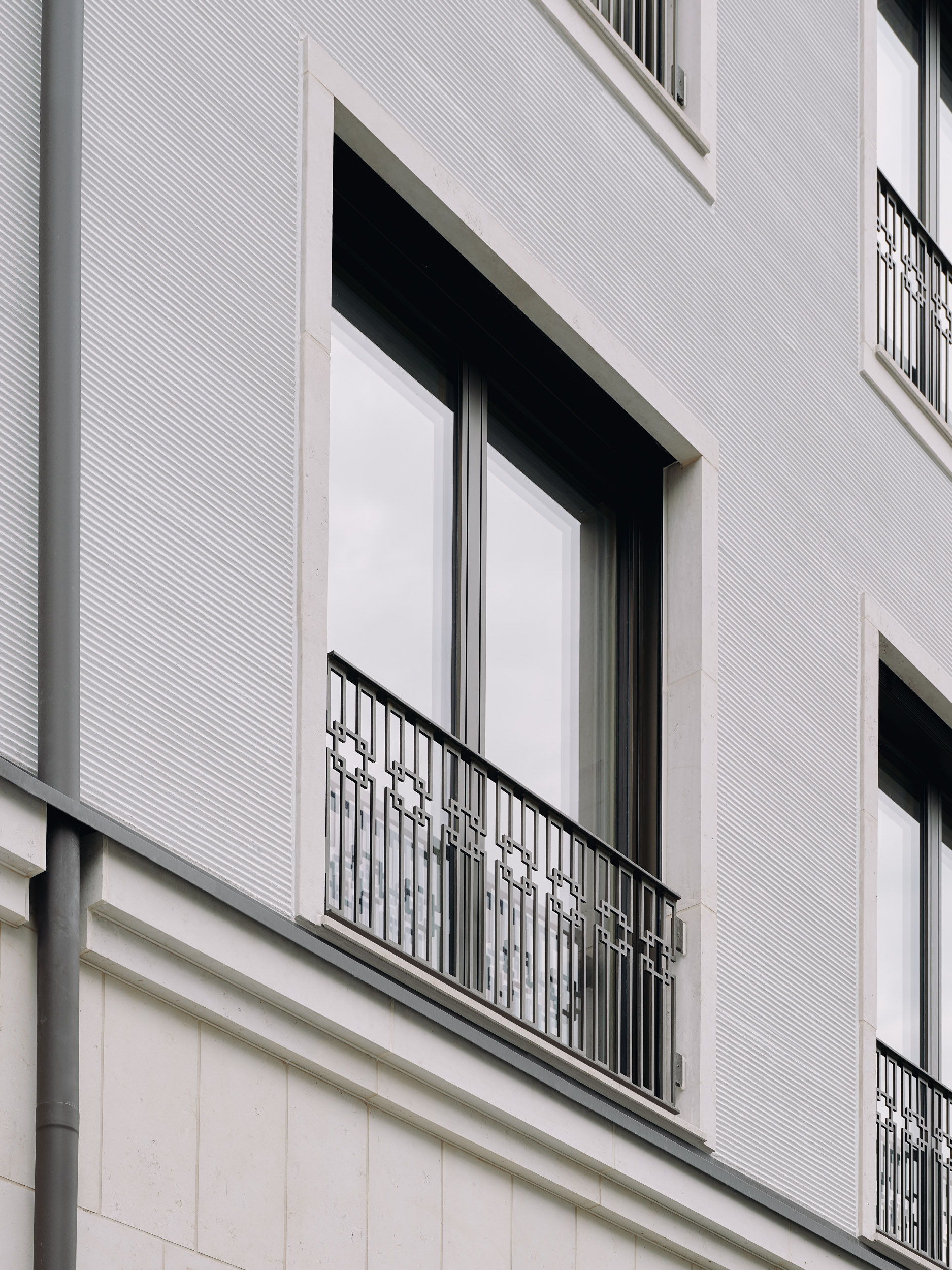 Die Fassade des Erdgeschosses ist mit hellen Natursteinplatten verkleidet und bildet eine ablesbare Sockelzone. Darüber folgt der Fassadenbereich des ersten bis dritten Obergeschosses, der mit handwerklich ausgeführten Putztechniken – dem Kammzug – gestaltet ist. Ein glatt verputztes Dachgeschoss schließt das Gebäude nach oben hin ab. Das Dach selbst ist als Mansardendach ausgebildet und hebt sich durch seine dunkle Farbgebung vom Baukörper ab.