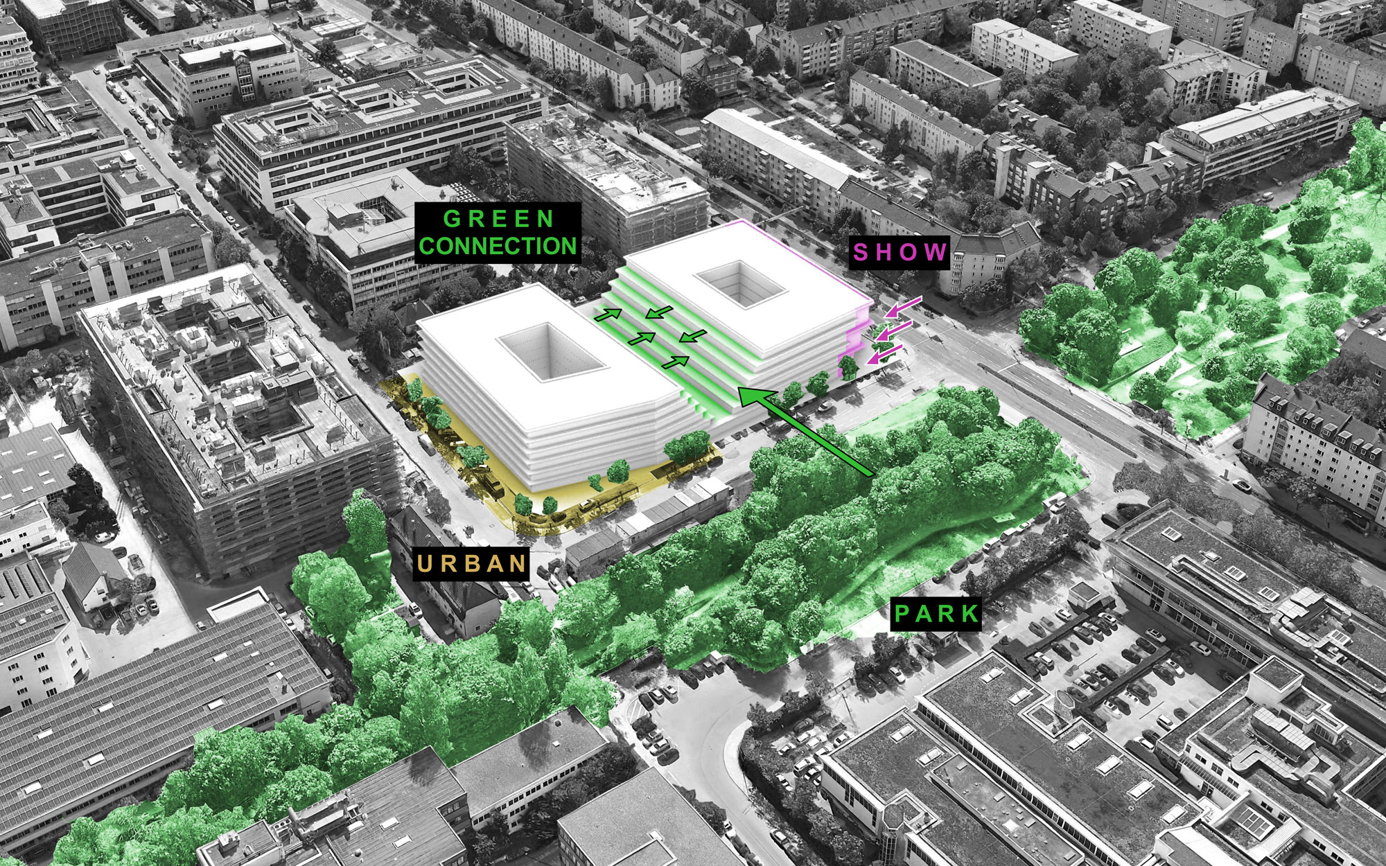 Vorgesehen sind zwei städtische Blöcke im Rahmen des Baurechts. Um einen Mehrwert zu schaffen, wird der Bereich zwischen den Gebäuden ab dem ersten Obergeschoss als abgestufte Terrassenlandschaft ausgebildet. Die dadurch entstehende grüne Oase nimmt unmittelbar Bezug auf den Grüngürtel der ehemaligen Trambahntrasse gegenüber. Um die neue Kubatur in das Quartier einzubinden, wird an der Taunusstraße ein urbaner Platz geschaffen.