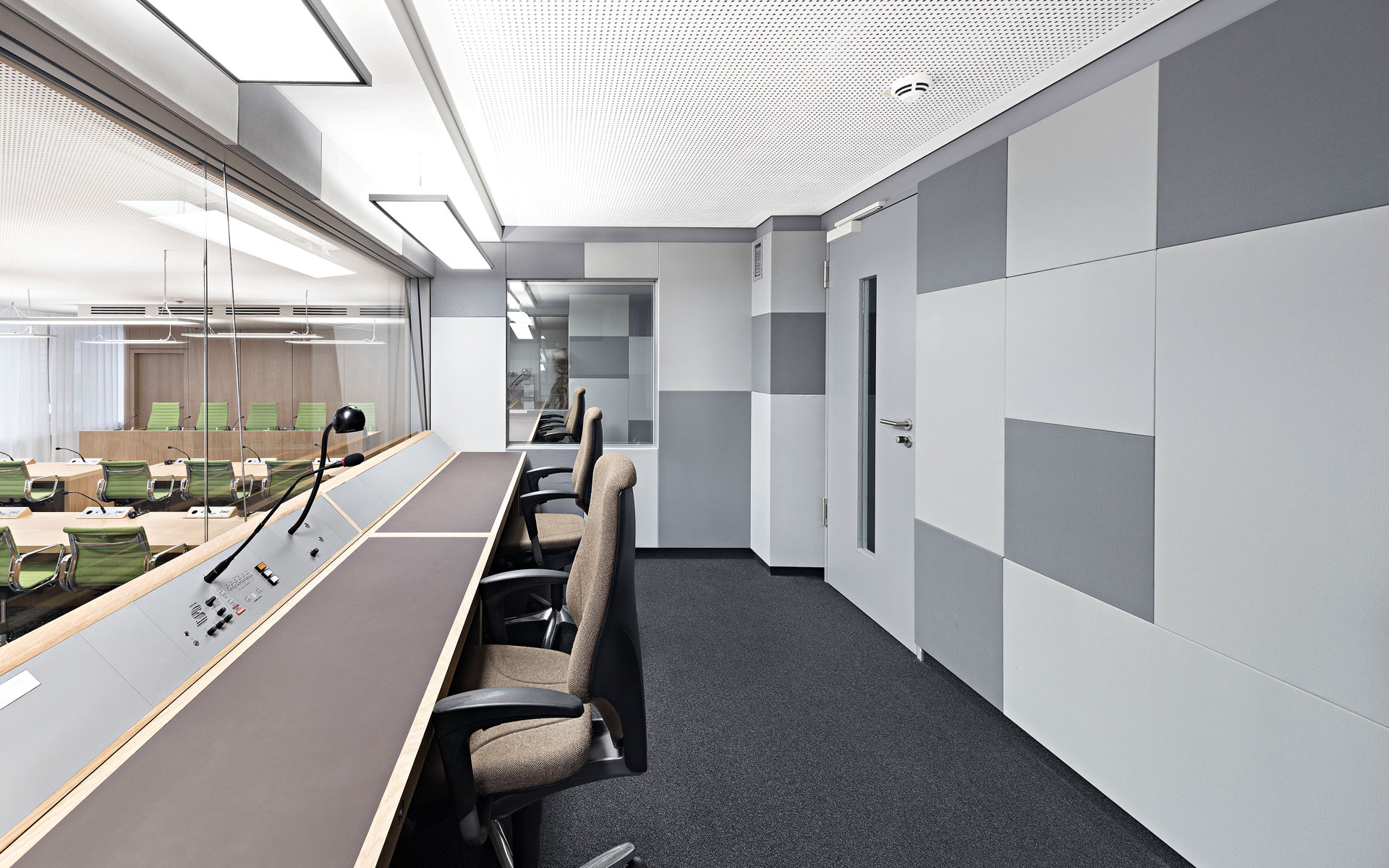 Im Erdgeschoss sind die insgesamt zehn Verhandlungssäle mit spezieller Kommunikationstechnik und Dolmetscherkabinen untergebracht. Zudem gibt es verschiedene Besprechungsräume, Parteibereiche und einen separaten Bereich für die Verwaltung. Die Beschwerdekammern sind in den beiden Obergeschossen angeordnet und der Präsidentenbereich bekommt im zweiten Obergeschoss einen separaten Flügel zugeordnet.