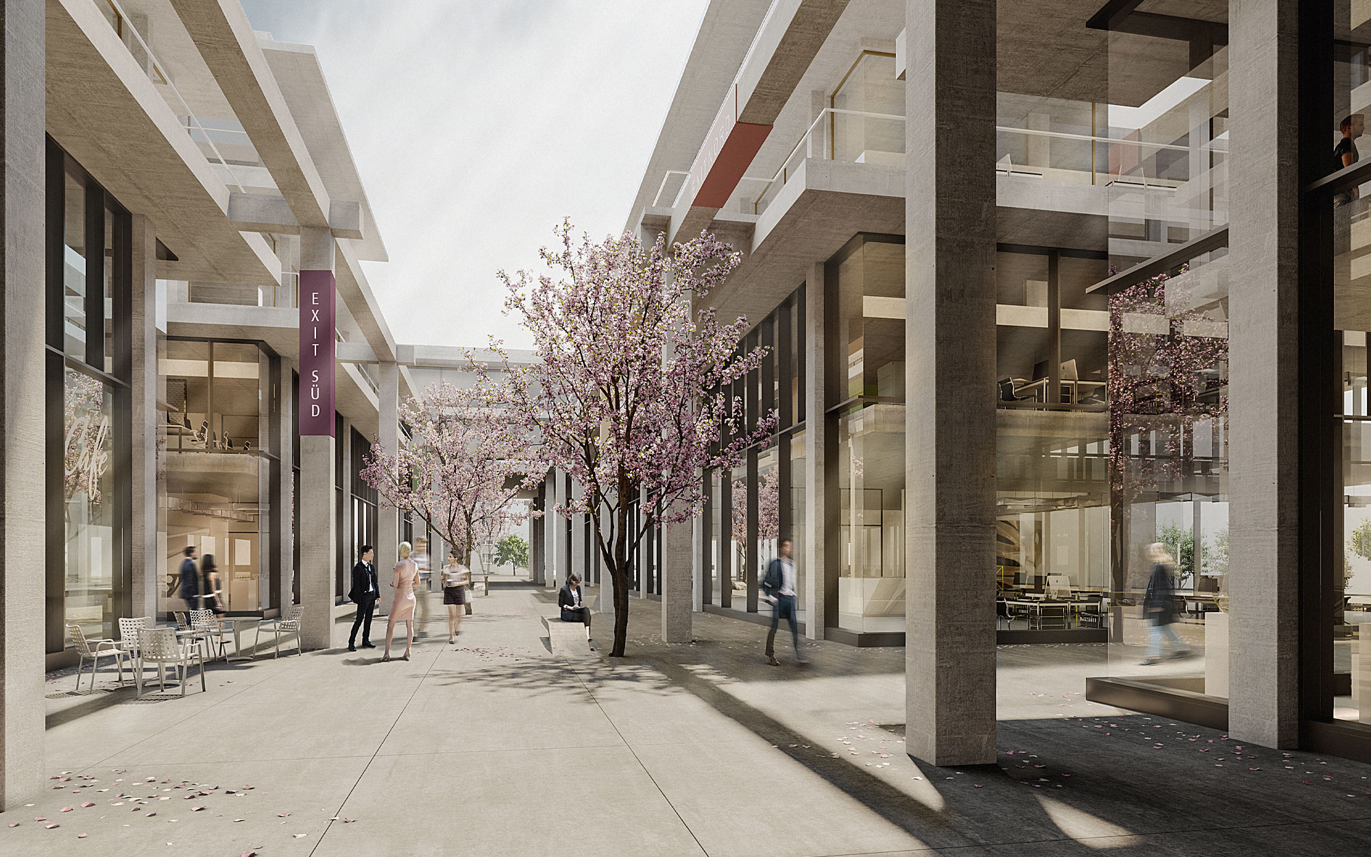Für den Transformationsprozess hin zu einem hochwertigen, außergewöhnlichen Gestaltungs- und Nutzungskonzept, schlagen wir eine prägnante Fassadengestaltung vor. Die Fassade greift Gestaltungselemente des unmittelbar benachbarten Olympia-Einkaufszentrums und der Pressestadt auf. Sichtbeton, auskragende Bodenplatten und eine symmetrische Arkadenreihe entlang der Magistrale bilden die Hauptelemente der Fassade.