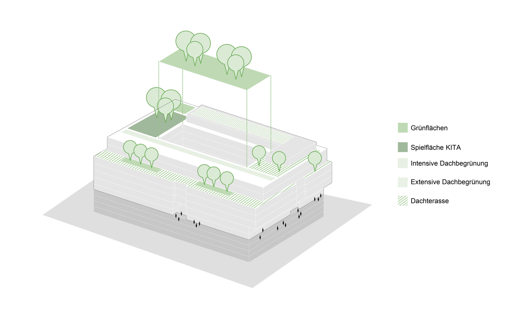 Die Dachflächen werden mit einer intensiven Begrünung ergänzt, um der Versiegelung der städtischen Flächen entgegenzuwirken. Durch die grüne Gestaltung der Freiflächen wird die Biodiversität gefördert, das Mikroklima positiv beeinflusst und attraktive Aufenthaltsorte für die Nutzer und die Öffentlichkeit geschaffen.