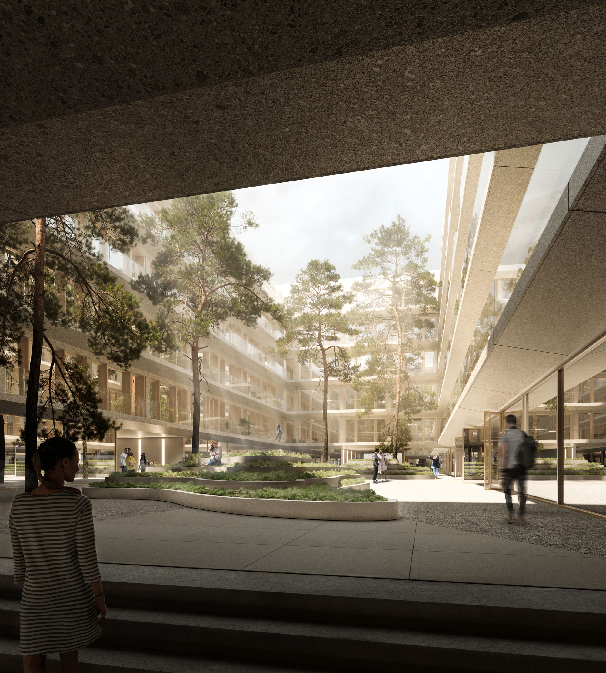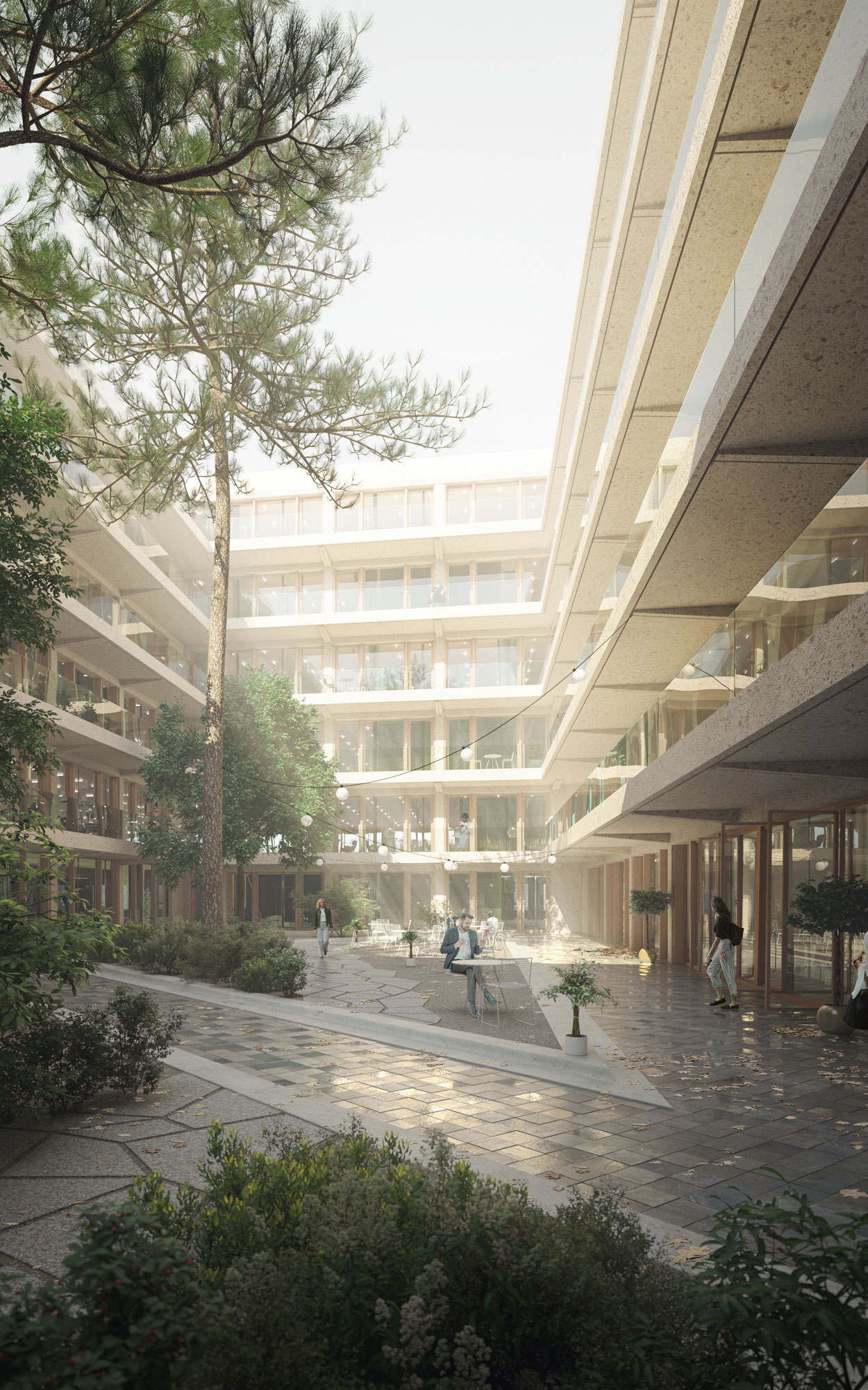 Mit einer großen Freitreppe wird die Durchwegung des Quartiers gefördert und ein, für die Öffentlichkeit frei zugänglicher Innenhof im ersten Obergeschoss geschaffen. Dieser optimiert die natürliche Belichtung und Belüftung und dient als zentraler Treffpunkt für die Nutzer.