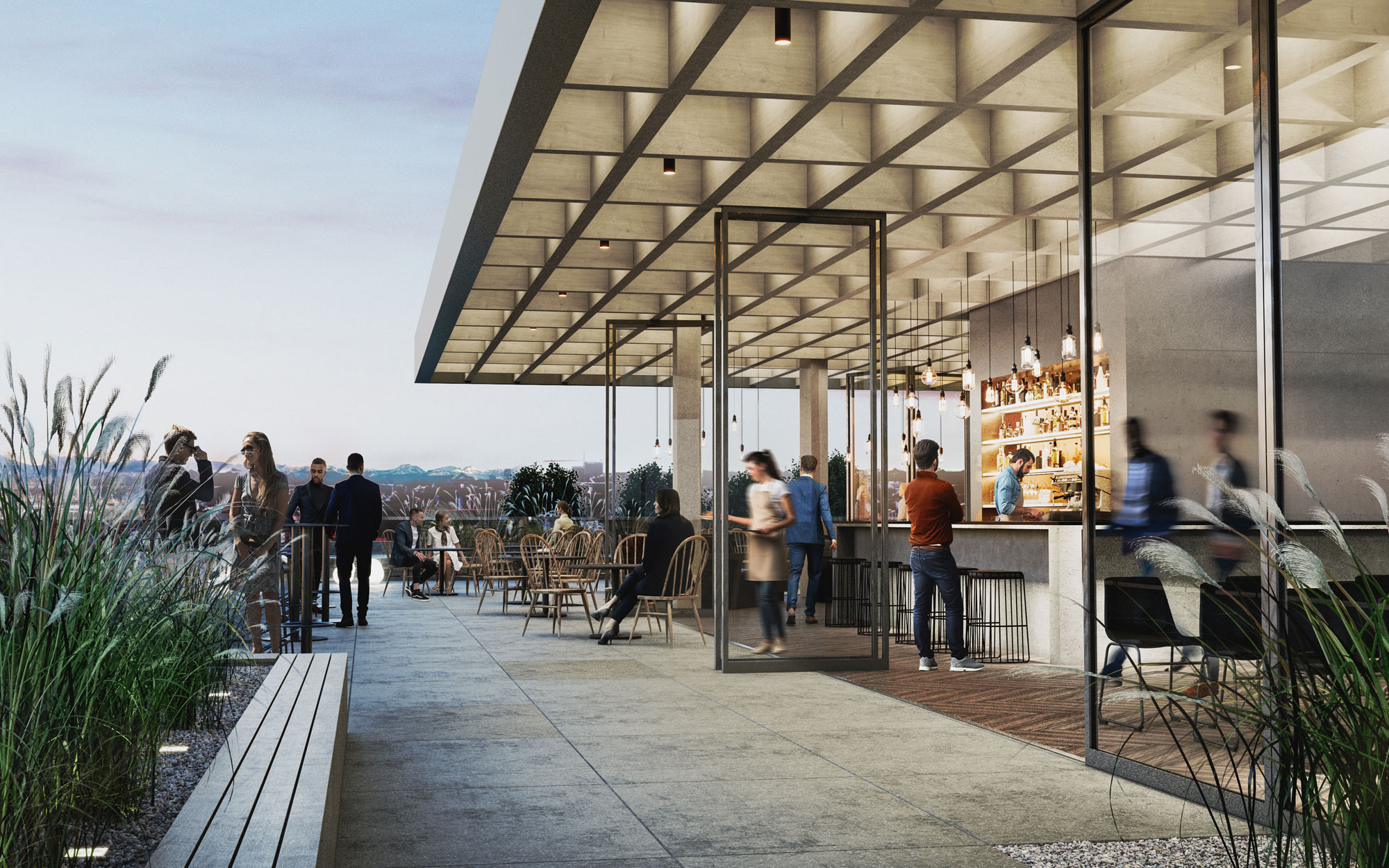 Das öffentlich zugängliche Dach mit Gastronomieangebot bietet einen attraktiven Freiraum mit Panoramablick.