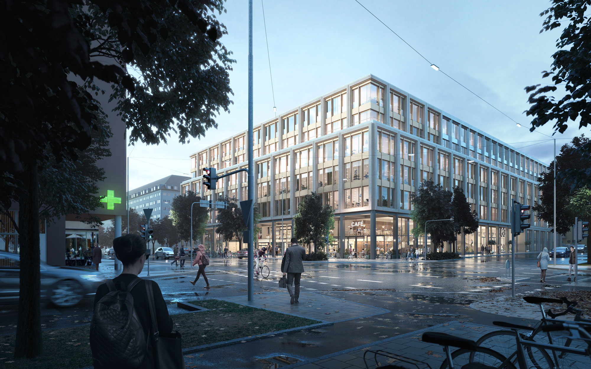 Der Stadtbaustein zeichnet sich durch drei große Öffnungen aus. Mit einer großen Geste öffnet sich das Gebäude zum Food Market und Gewerbeflächen. Ein repräsentatives Foyer an der Schleißheimer Straße bildet den Zugang zu den Obergeschossen. Die flexibel nutzbaren Büroflächen sind so konzipiert, dass sie zukünftige Nutzungsänderungen ohne weiteres ermöglichen.