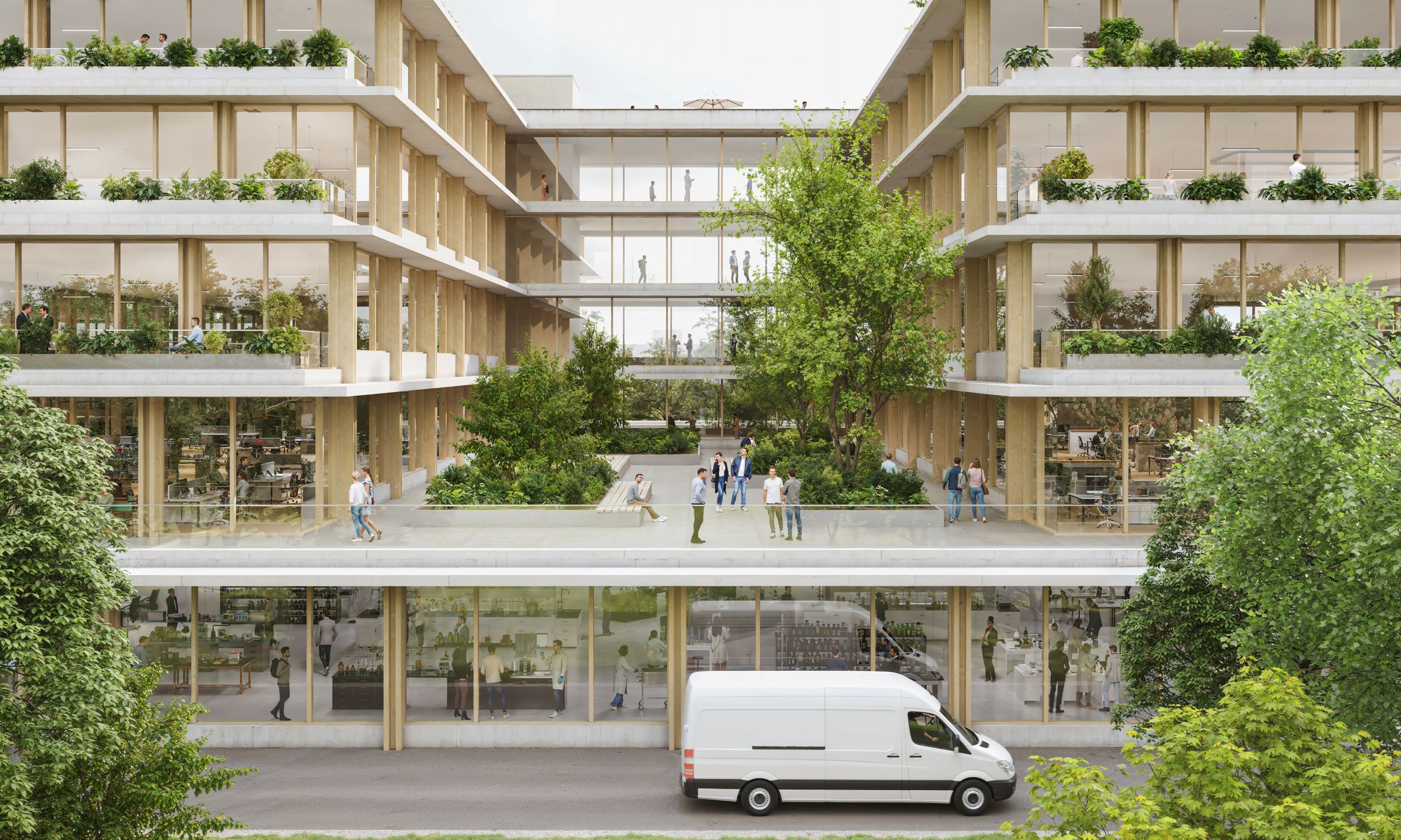 Der Entwurf sieht eine klare Riegelstruktur mit drei identischen Baukörpern vor, die durch zwei zentrale Gebäude verbunden werden. Diese Anordnung ermöglicht effiziente Grundrisse und kurze Wege, während die lichten Geschosshöhen von 4,2 Metern eine hohe technische und räumlich Anpassungsfähigkeit gewährleisten. Das Erdgeschoss wird als zusammenhängende, großzügige Zone ausgebildet, die sich für gemeinschaftliche und repräsentative Nutzungen wie Empfang, Showroom oder Gastronomie eignet.