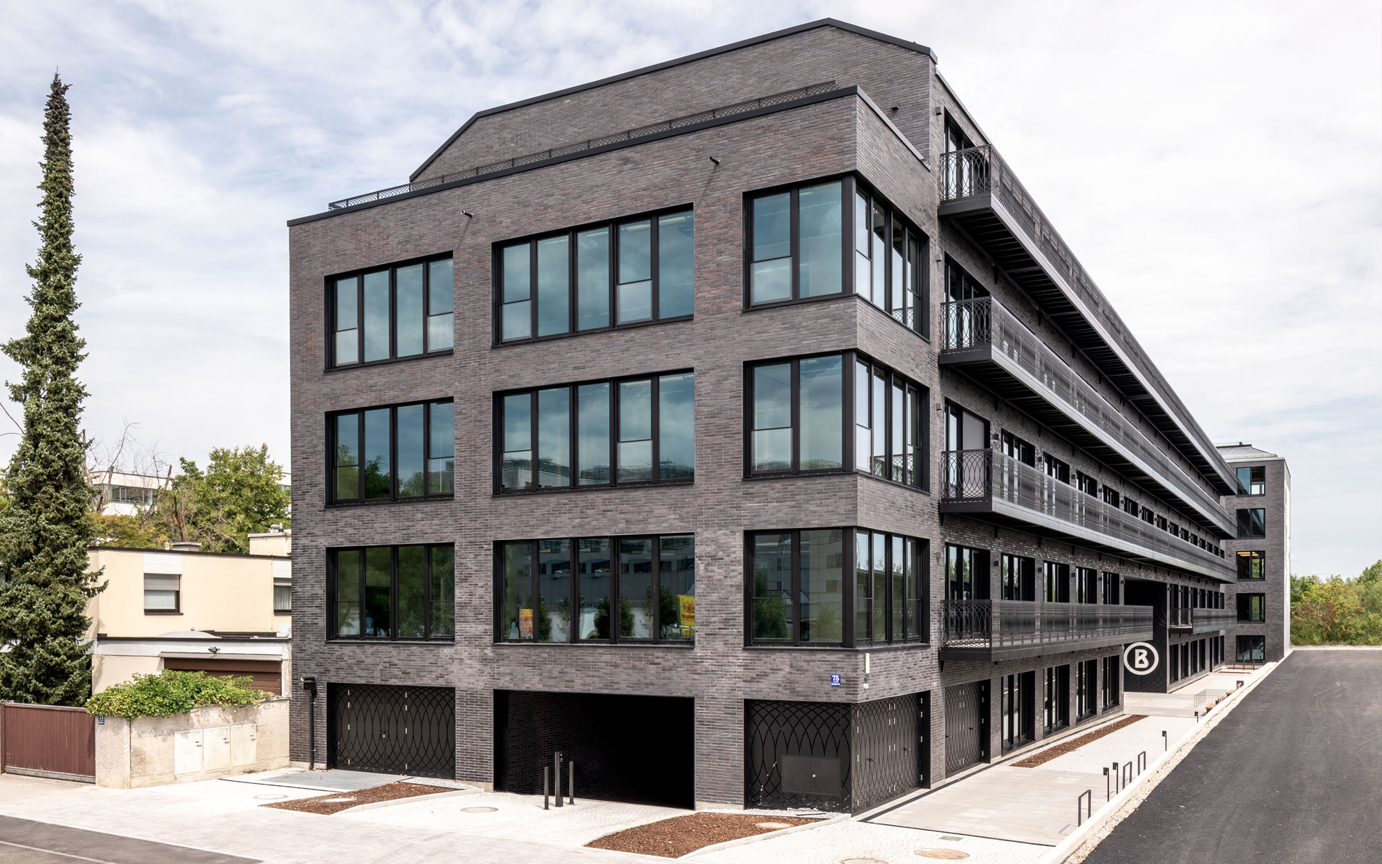 Die elegante Fassade spielt mit einem schwarz auf schwarz Effekt aus Klinker und Metall. Der Kontrast der massiven Materialität und der großen Fensterflächen mit der filigranen Balkonkonstruktion belebt die Fassade und hebt sich von den klassisch gerasterten Bürofassaden ab. Durch die Ornamentik der Balkonbrüstungen ergibt sich je nach Perspektive ein spannendes Wechselspiel.