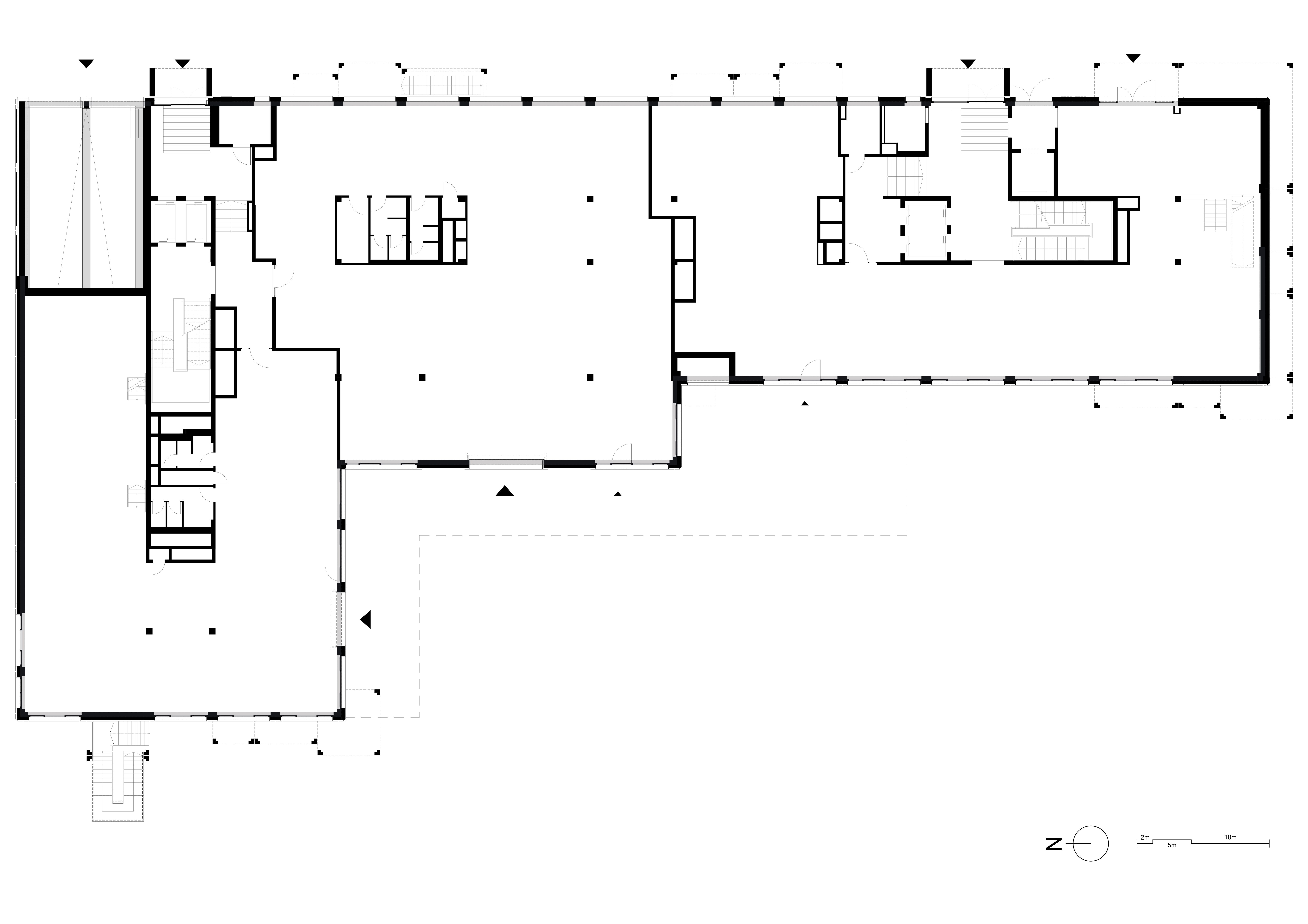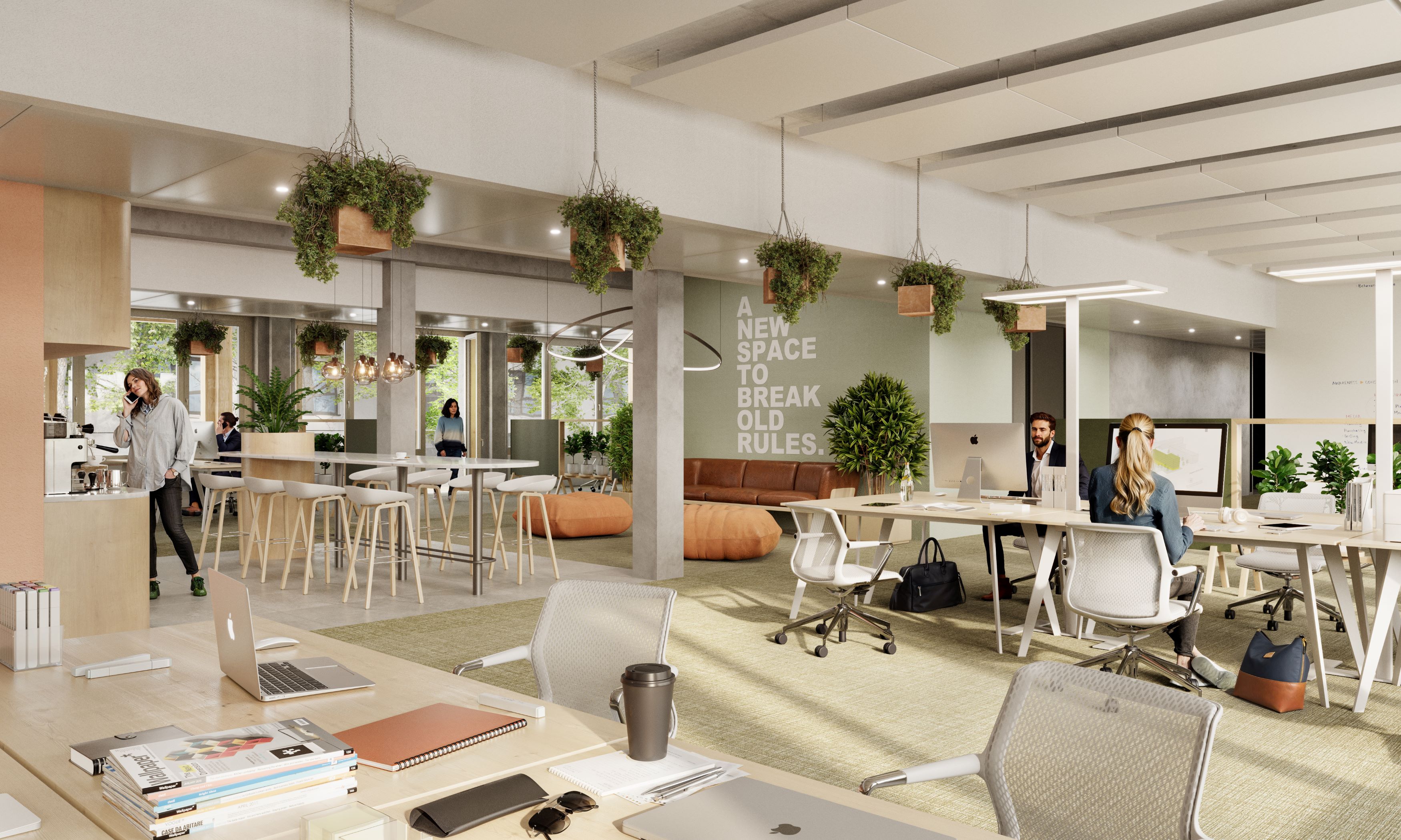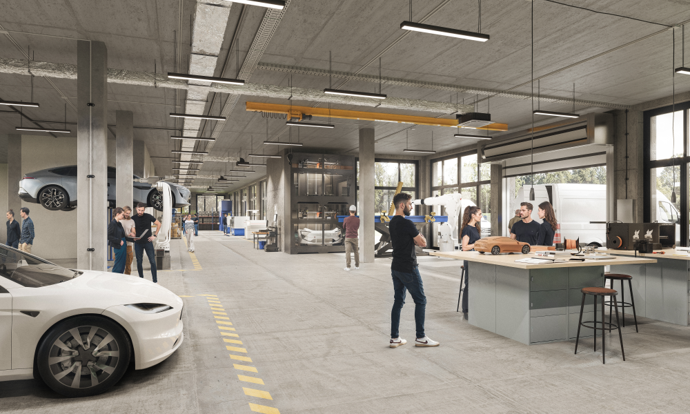 Die Architektur knüpft an die industrielle Prägung des Umfelds an und übersetzt sie in eine robuste, leistungsfähige Gebäudestruktur. Im Erdgeschoss ermöglichen große Stützweiten, hohe Raumhöhen und erhöhte Traglasten Flächen für Produktion, Entwicklung und Gewerbe. Darüber entstehen effiziente Büroebenen. Vorgelagerte Terrassen und Austrittsflächen erweitern die Arbeitswelt nach außen und schaffen zusätzliche Aufenthaltsqualität im Grünzug.