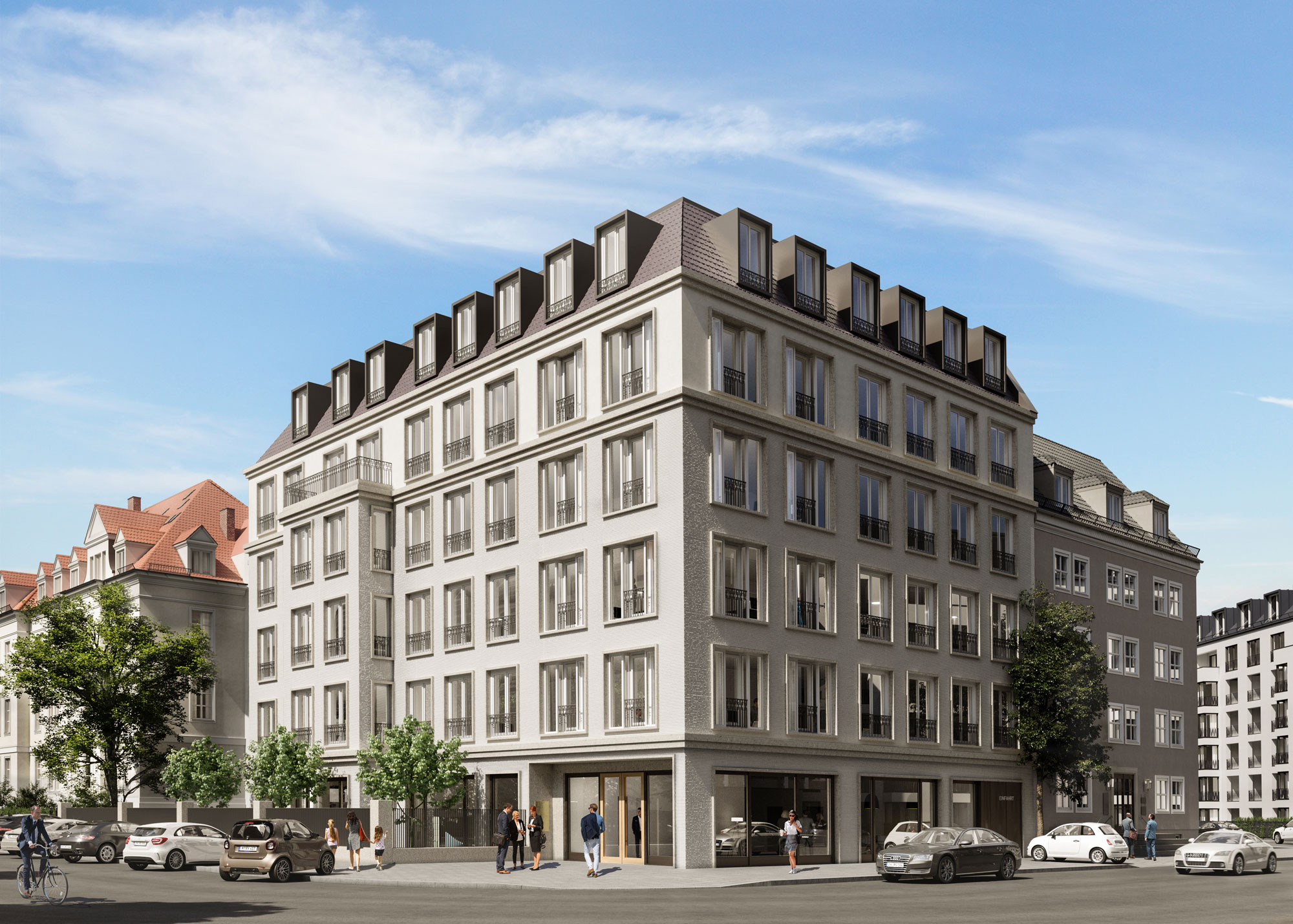 The design follows the cubature of the existing building from the 1950s and thus closes the block. The façade picks up on the elements of the surrounding Wilhelminian-style buildings and transfers them to the present day.