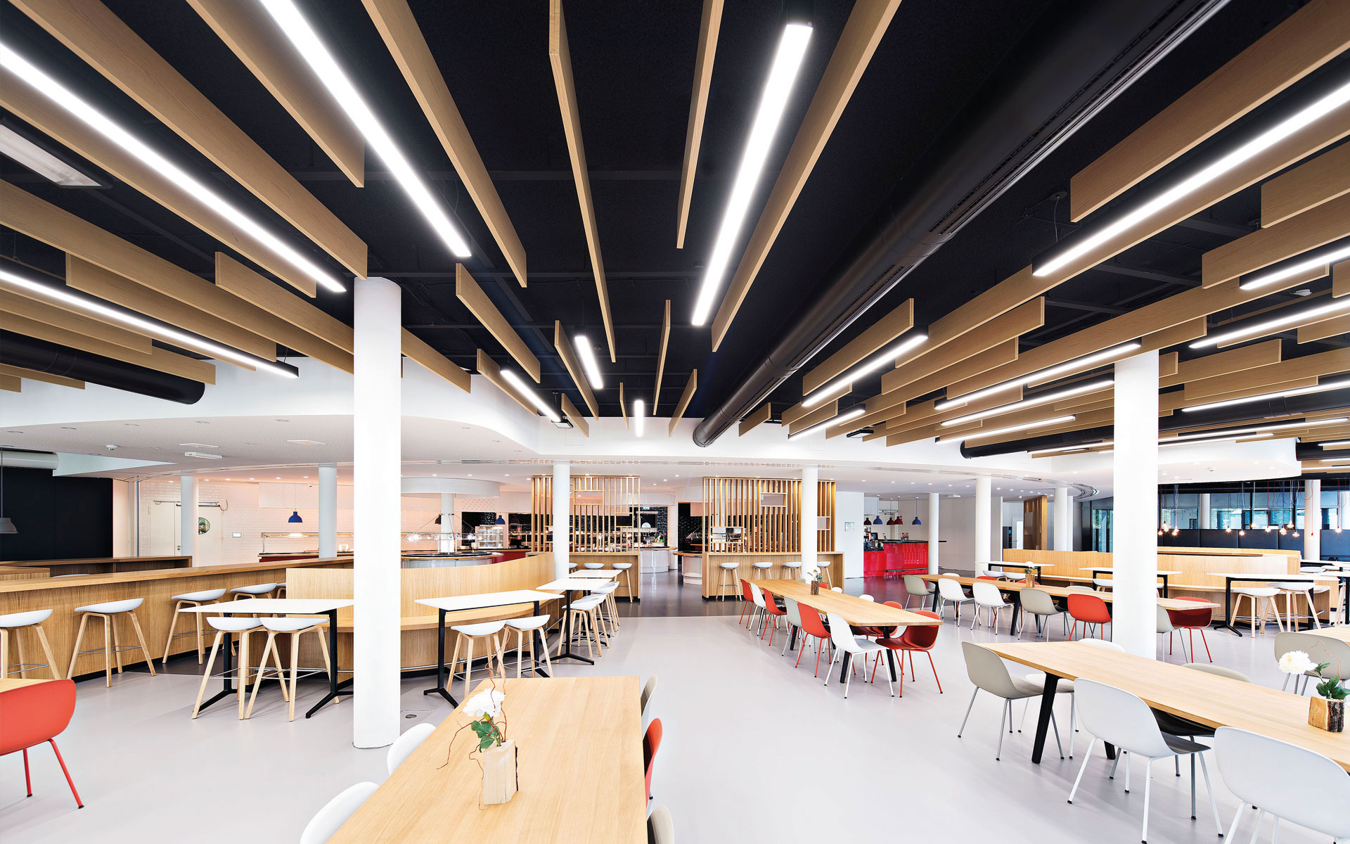 Urban, human and innovative are the three premises of the architectural interior design. Smooth surfaces, warm materials, rhythmic grids and targeted lighting accents generate the feeling of a livable place with modern and urban echoes. Recurring design elements create an iconic architectural language that has already won the Iconic Award 2018 in the canteen area.