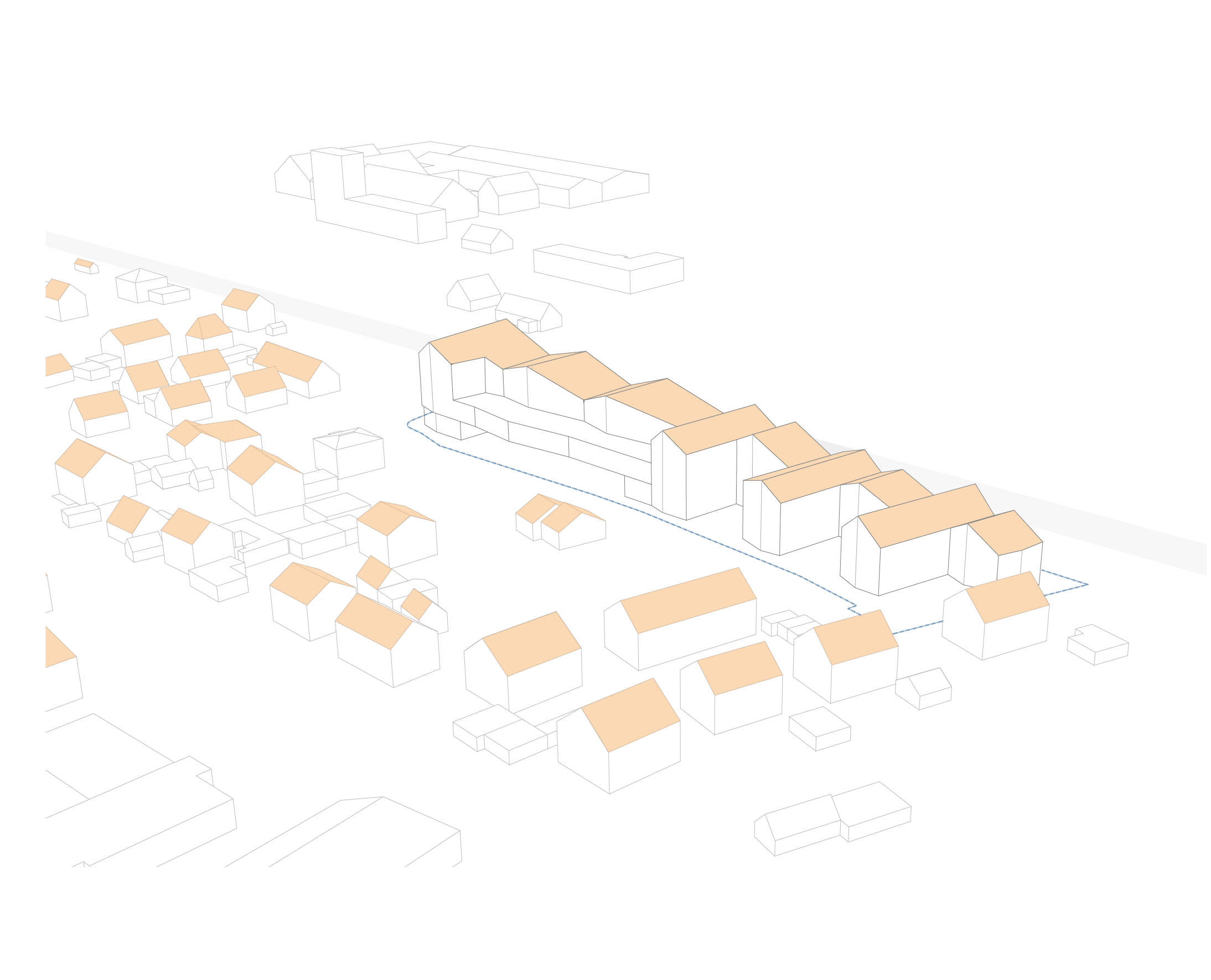 The local supply center consists of four L-shaped structures that protect the buildings and neighborhoods from noise to the east and create open, private open spaces to the west. The height development adapts to the south and ensures optimal lighting conditions in green courtyards. The L-shaped structure creates a natural transition to the small-scale development, and the head-end building serves as a distinct address for services and the park & ride.