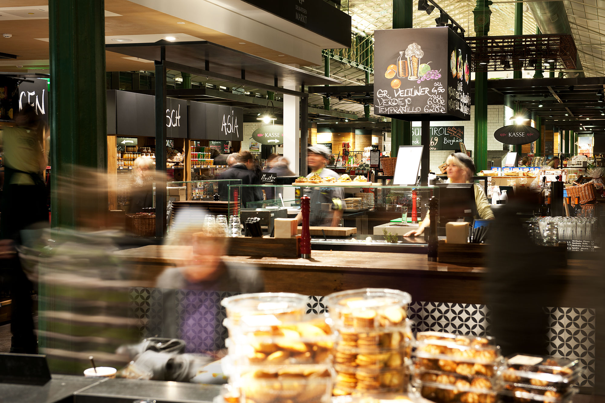 Optische Lichtpunkte entstehen durch die Verwendung weißer Fliesen an den Marktständen, von denen sich die einheitlich dunklen Schieferlacktafeln für Preis- und Produktinformationen abheben.