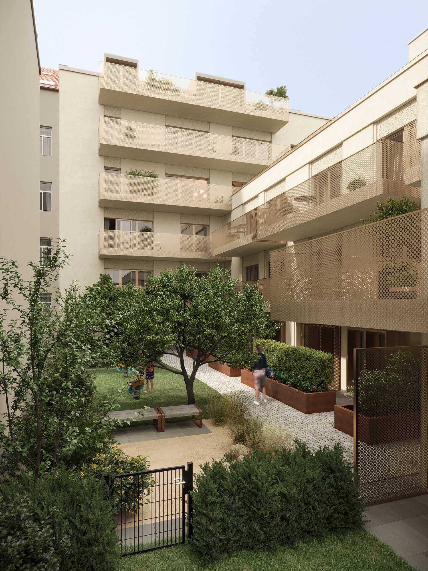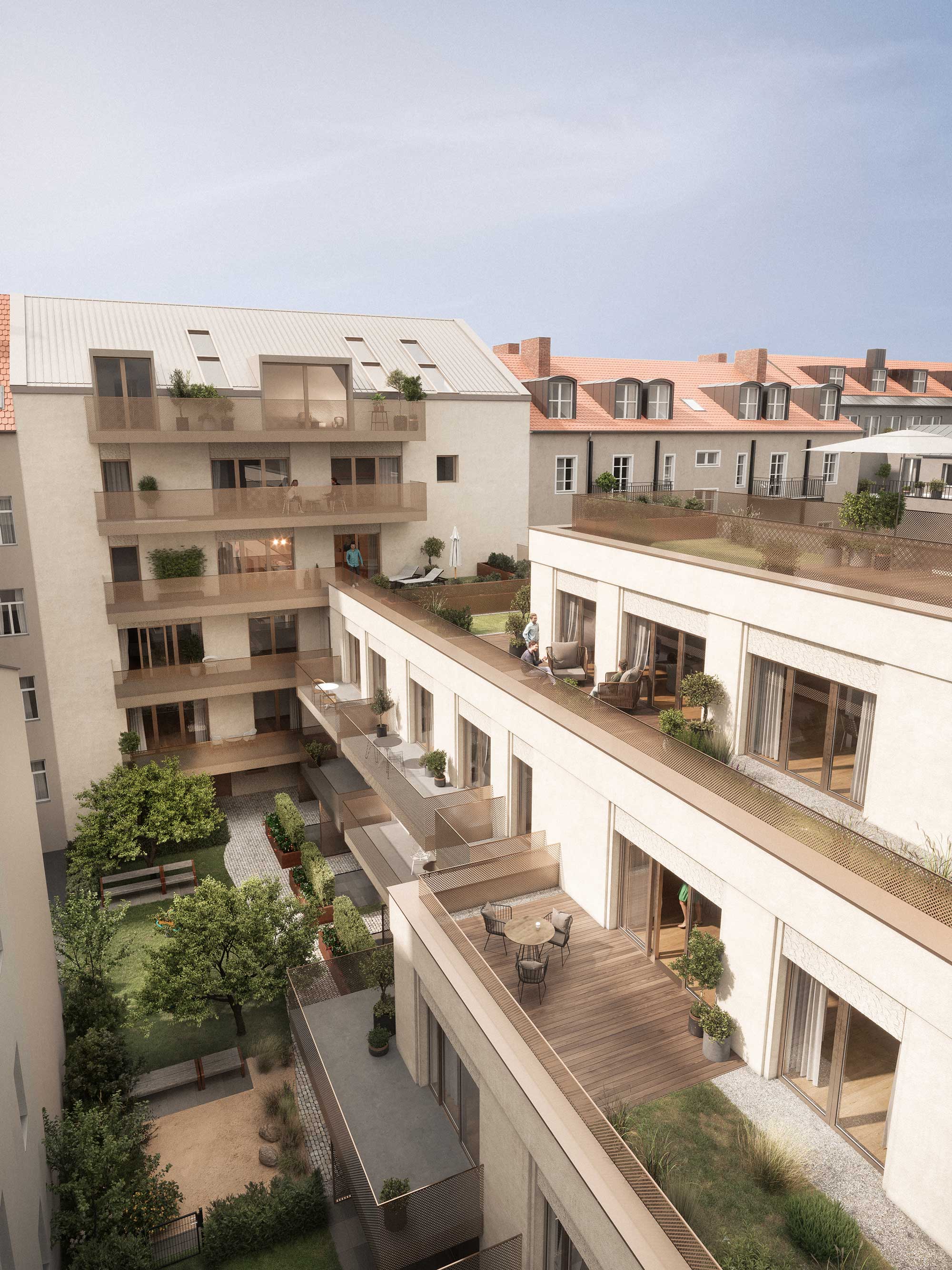 The inner courtyard of the property will be green and include playground areas, raised planting beds and private lawns and terraces. This creates attractive open spaces for the residents and promotes quality of life.