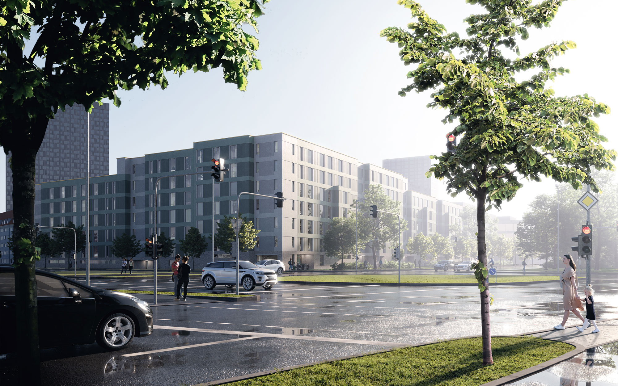 The architectural design focuses on an unagitated, timelessly elegant appearance. Projections and recesses of the outward-facing facades rhythmize and structure the long building and define the entrance areas. Recesses, balconies and loggias facing the inner courtyards create high-quality open spaces for the residents.