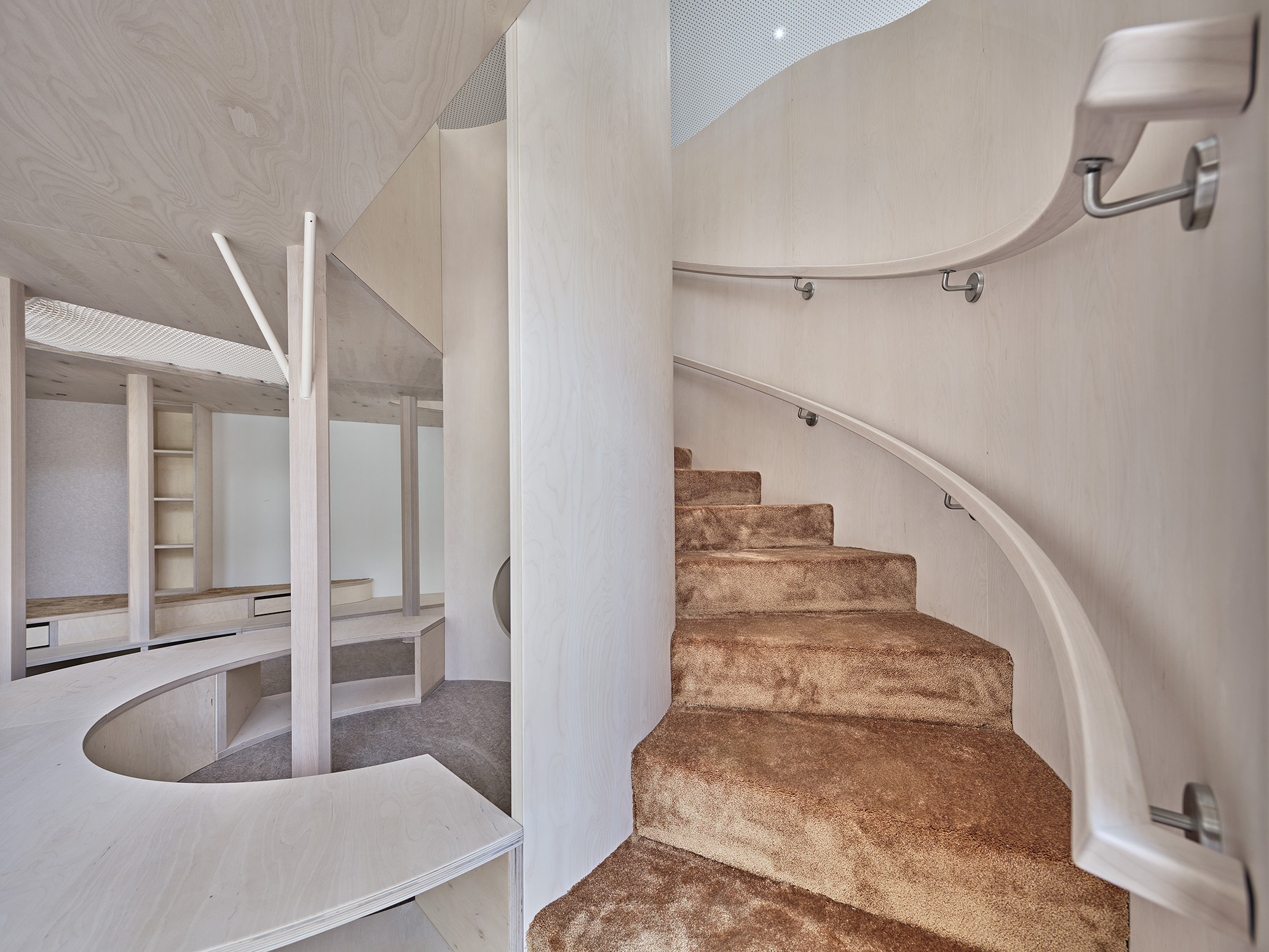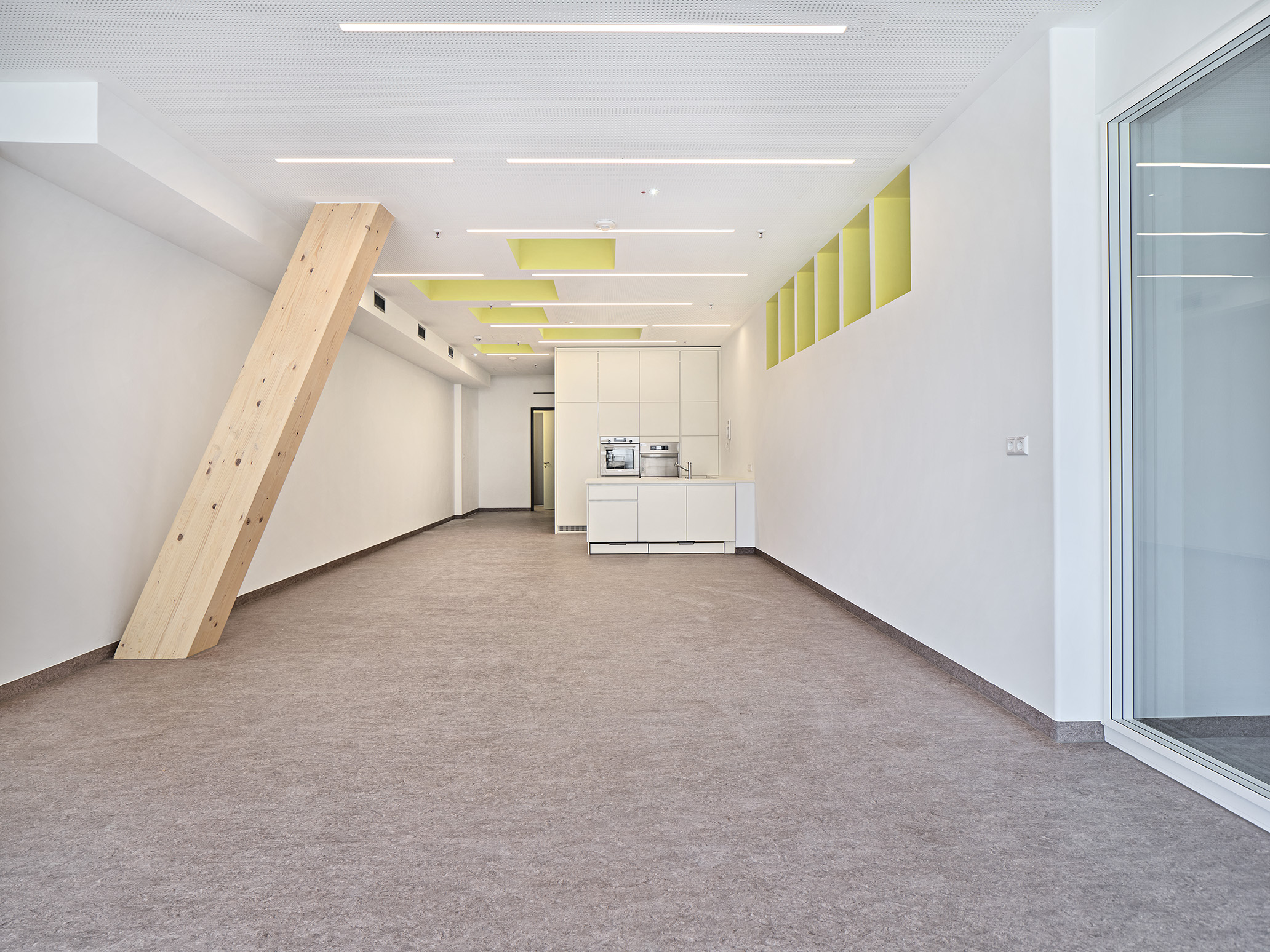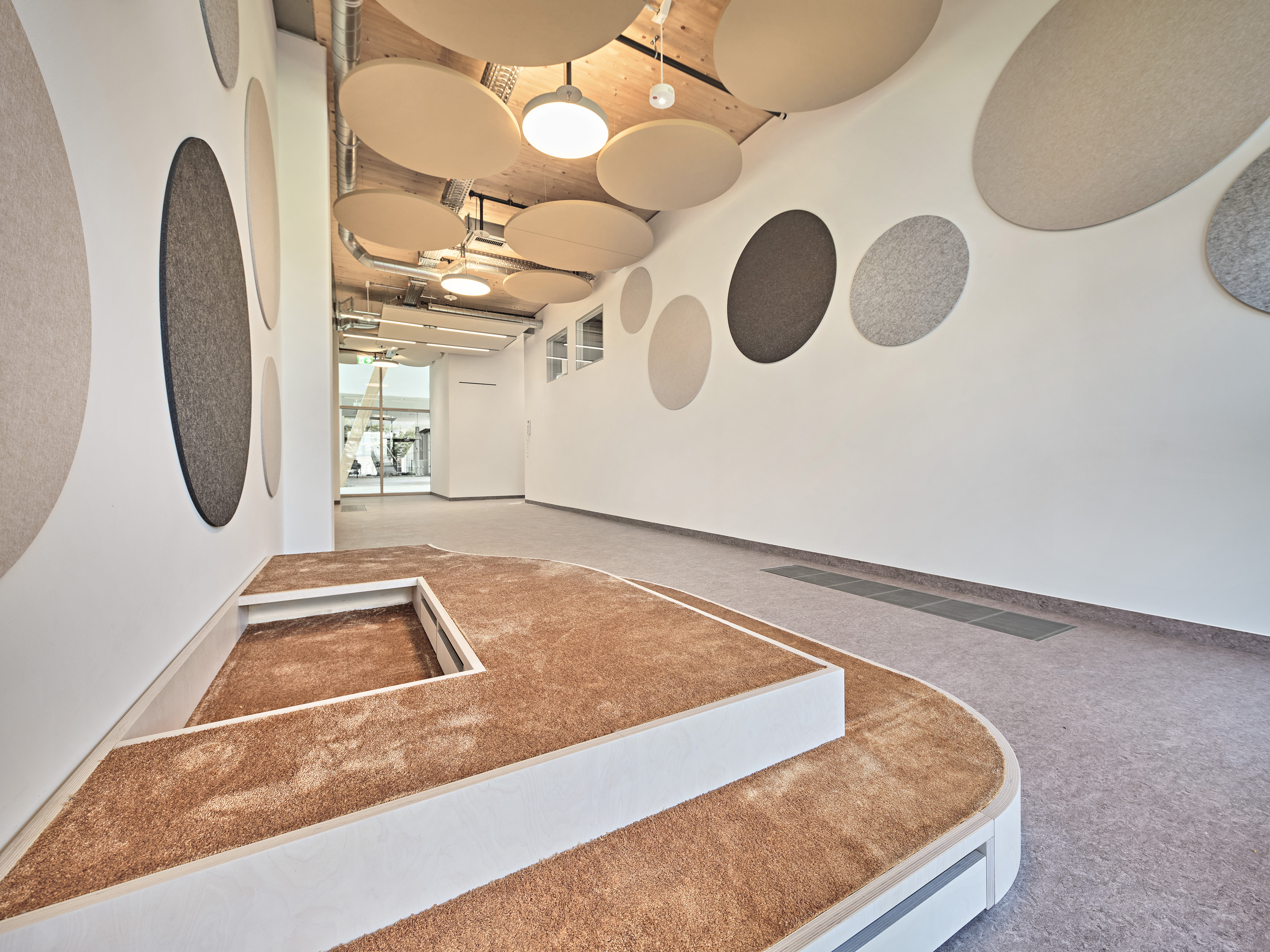 Die neu geschaffene Kita bietet eine abwechslungsreiche und sichere Umgebung mit viel Platz zum Spielen und Lernen. Besondere Merkmale sind maßgefertigte, doppelstöckige Holzeinbauten, die an die jeweilige Raumgröße angepasst sind und die Bewegungsfreude der Kinder fördern sollen, sowie unterschiedliche Zonierungen innerhalb der Räume, für Entdeckungstouren und Rückzugsmöglichkeiten
