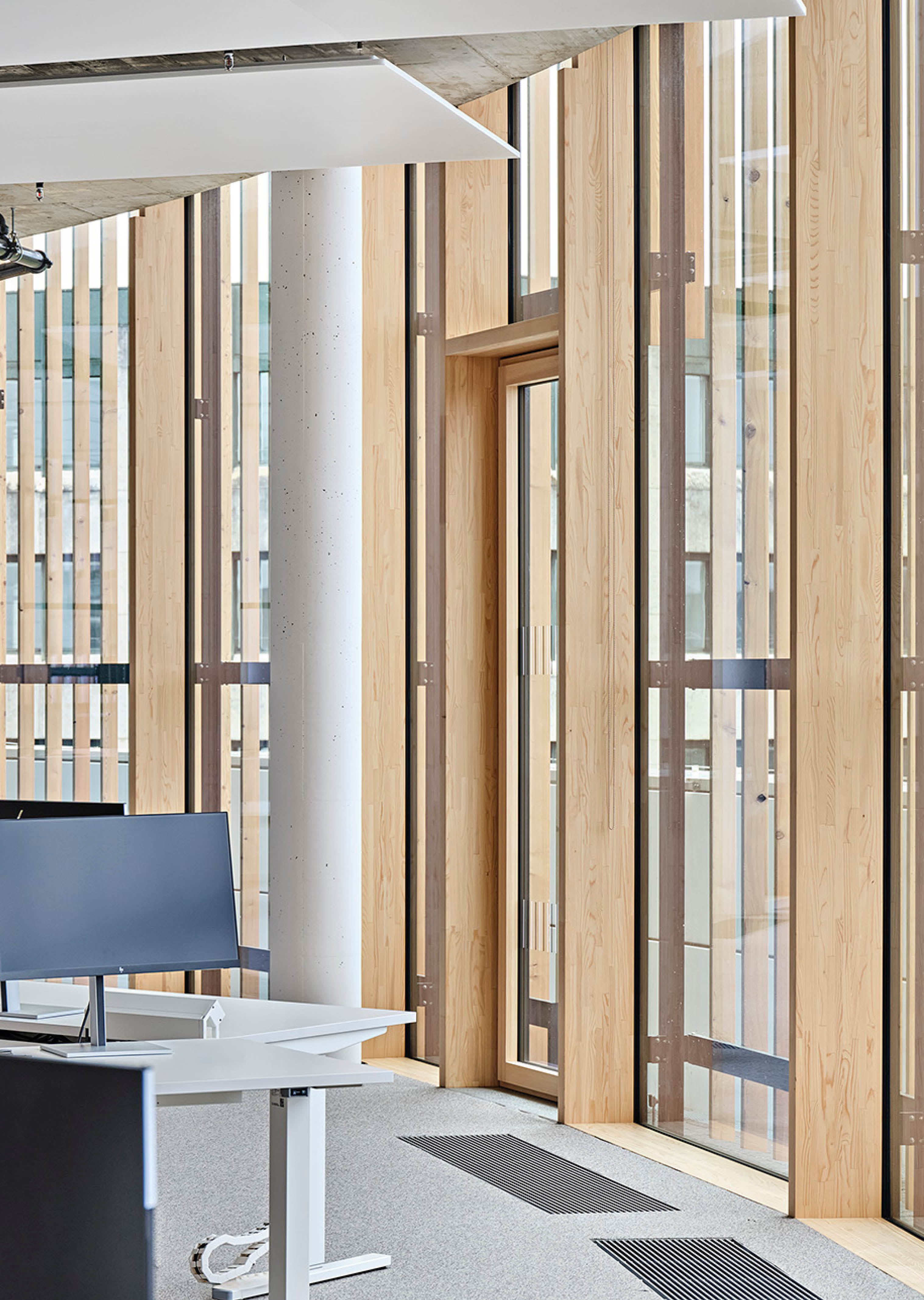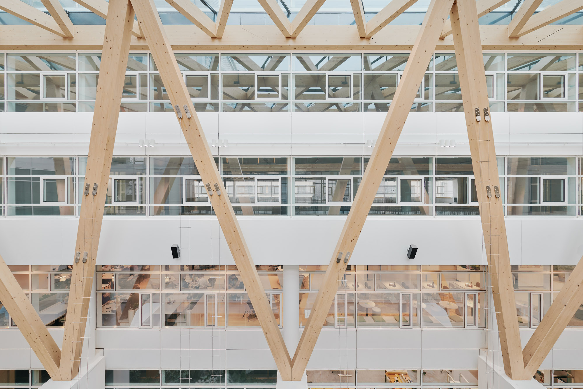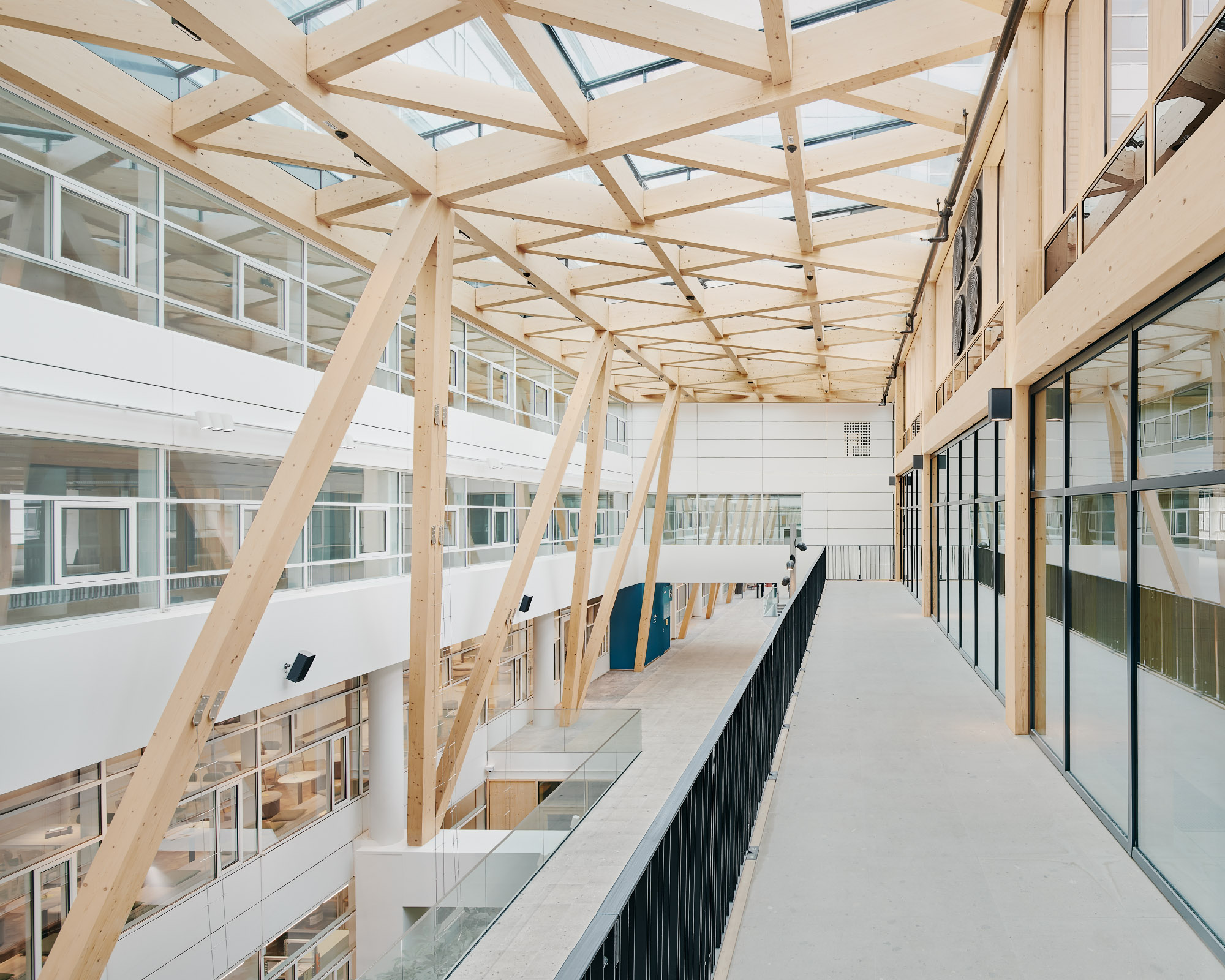 Die Nachverdichtung der Bestandsfläche wird mit neuen Holzverbunddecken in fünf Geschossen und drei Atrien realisiert. Die Verwendung dieser unterstützt nicht nur die architektonische Ästhetik des Bestandes, sondern sorgt auch für optimale akustische Bedingungen.