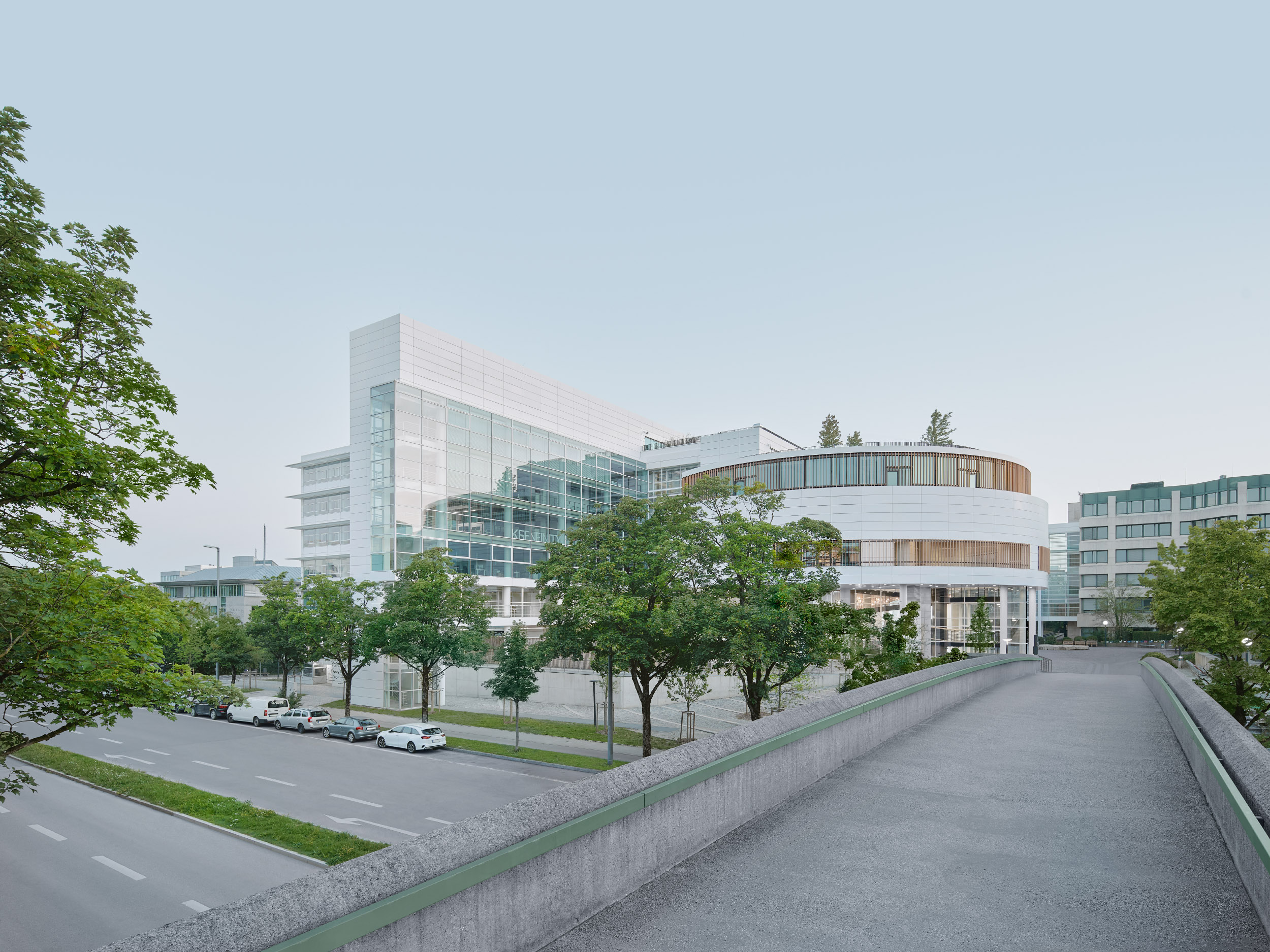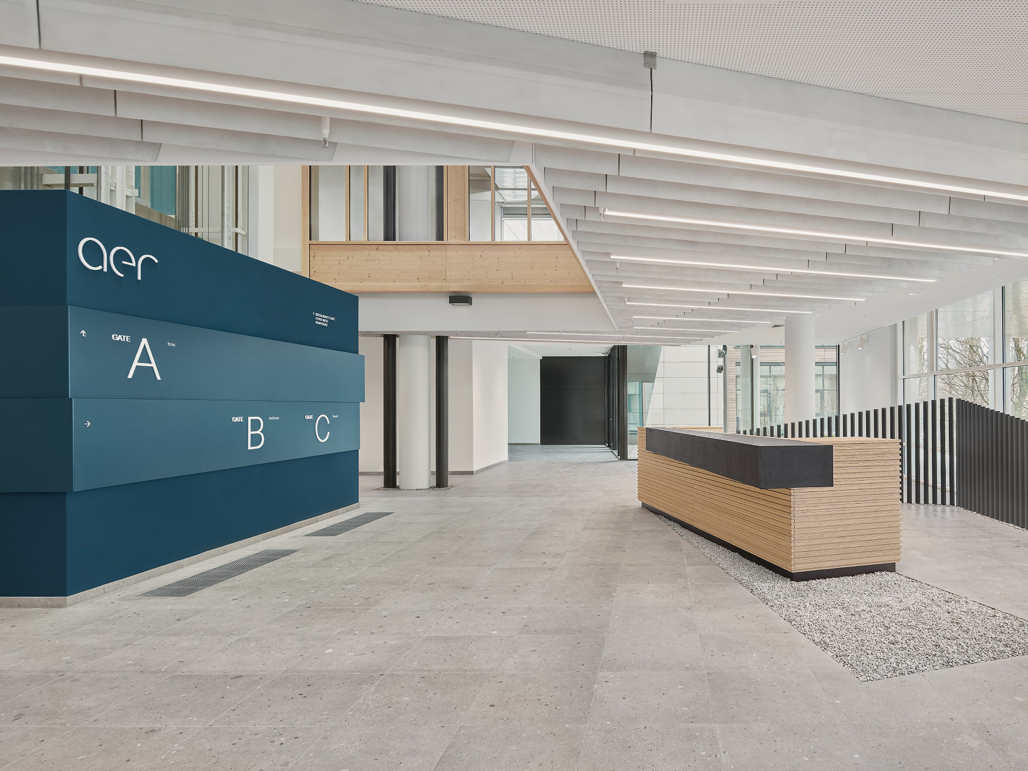 „aer Hall“ ist die neue zentrale Erschließung zwischen dem Hauptgebäude und den Satellitenbauten. Diese wird zum neuen identitätsstiftentenden Element und sorgt für kurze Wege zwischen den jeweiligen Gebäudeteilen und Nutzungseinheiten.
