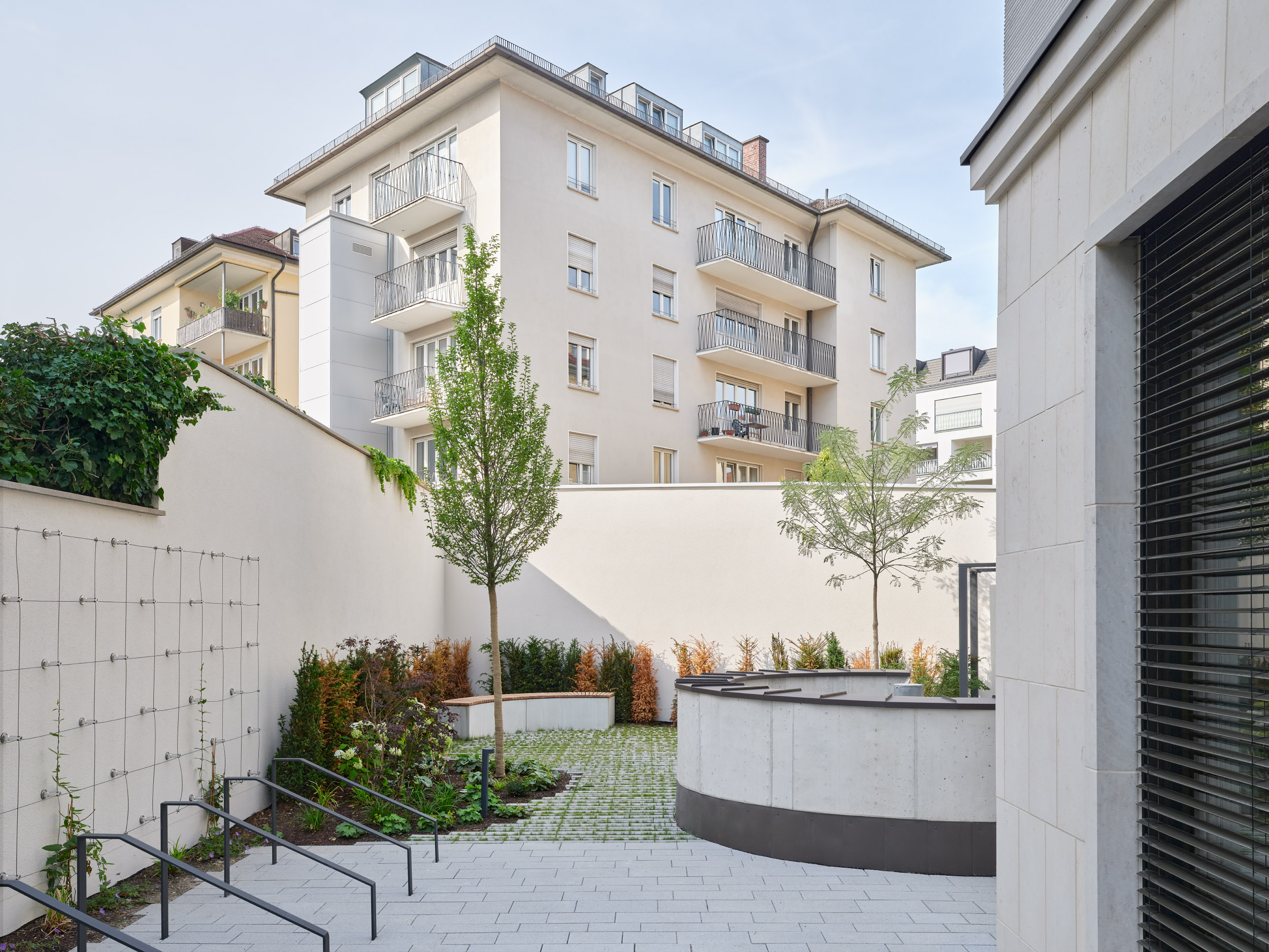 Der private Gartenbereich auf der Rückseite nimmt die Gestaltung der angrenzenden Gärten auf und fügt sich stimmig in das gewachsene Umfeld der Ludwigsvorstadt ein. Pergolen, Pflanzflächen und Sitznischen schaffen Aufenthaltsqualität und einen nutzbaren Außenraum im Arbeitsalltag. Die sorgfältige Freiraumgestaltung ergänzt den architektonischen Anspruch des Gebäudes und stärkt dessen Einbindung ins Quartier