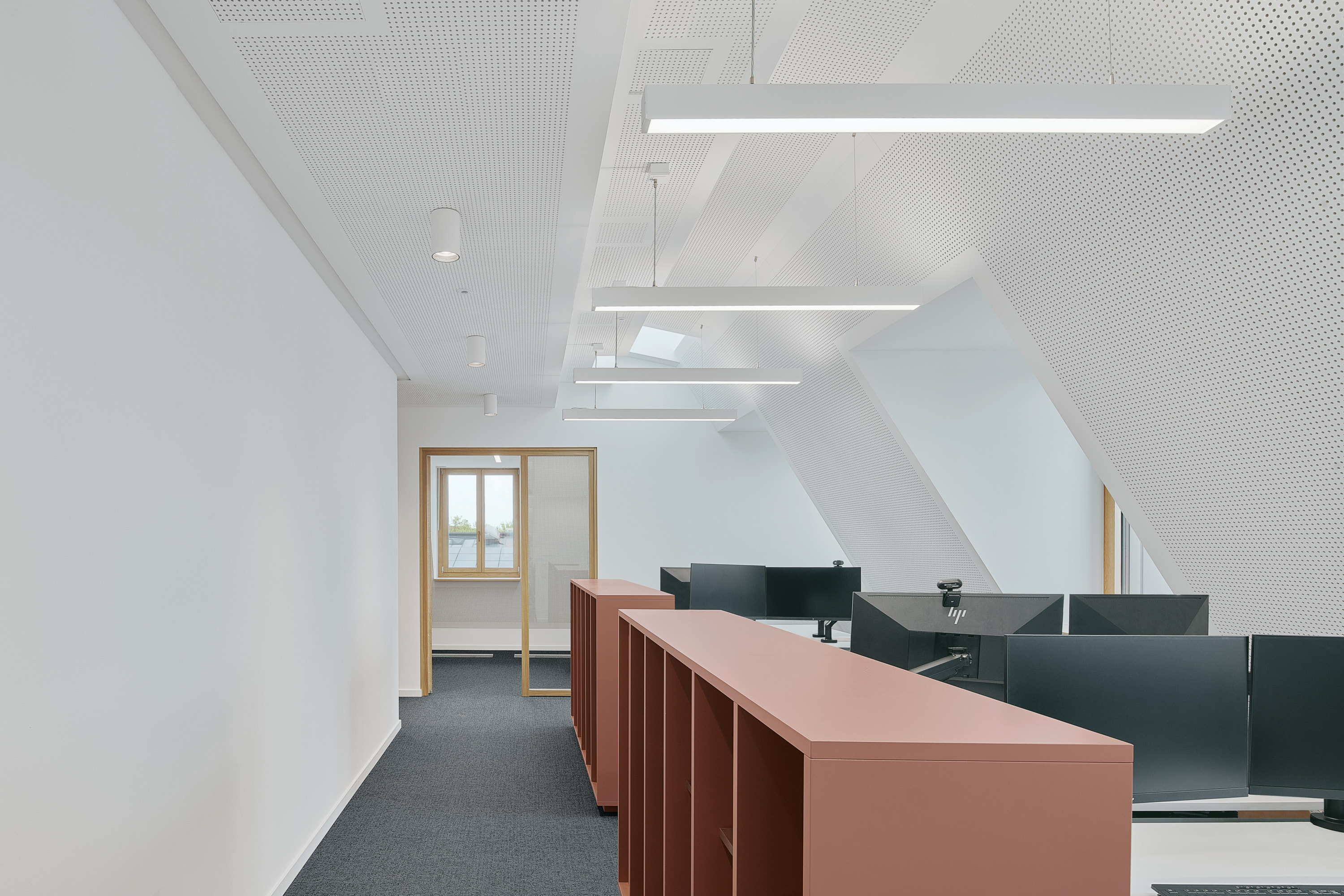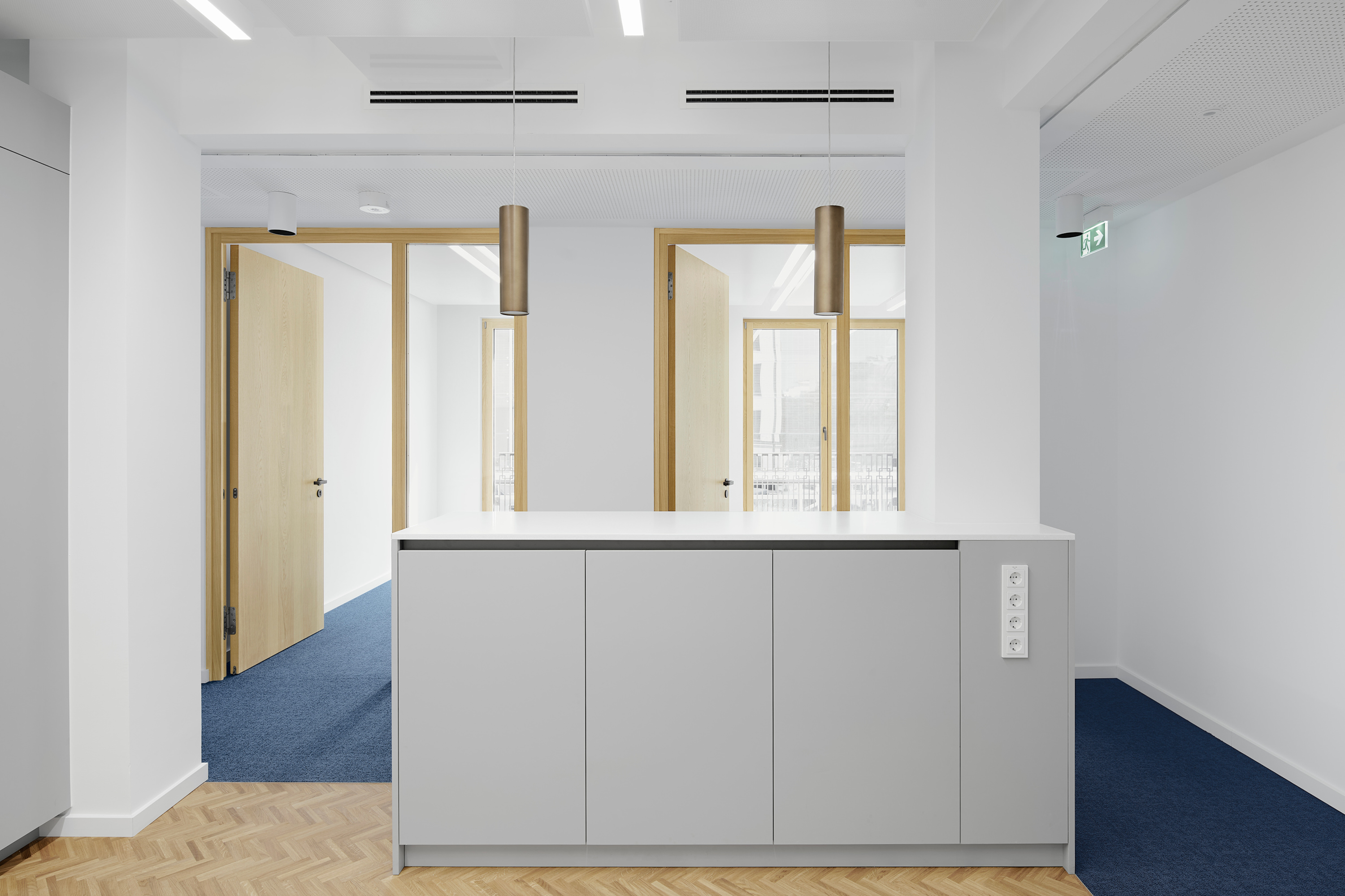 Die Grundrisse der Obergeschosse ermöglichen unterschiedlichste Büroeinheiten und Zonierungen – von Einzelbüros über helle Besprechungsräume bis hin zu offenen Aufenthaltsbereichen auf verschiedenen Geschossen. Auf jeder Etage steht eine Teeküche zur Verfügung, im vierten Obergeschoss zusätzlich eine großzügige Gemeinschaftsküche mit hochwertiger Ausstattung.