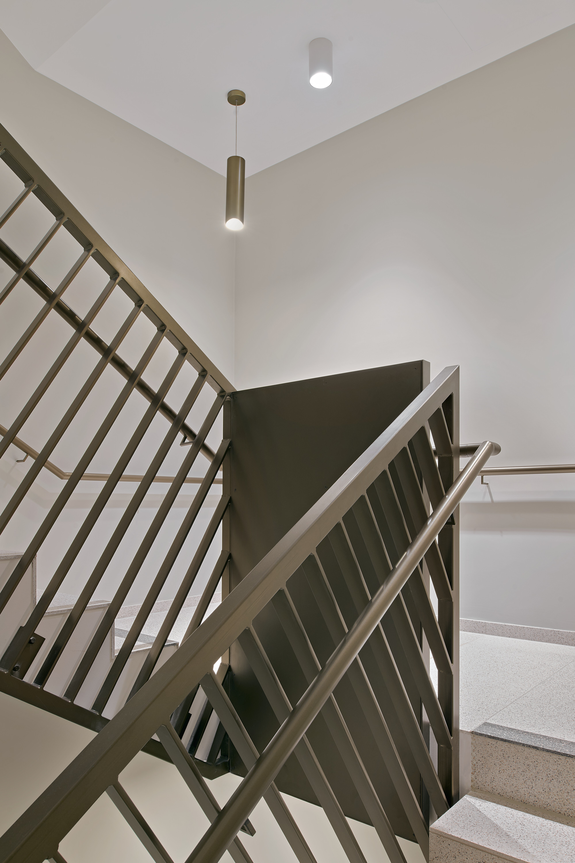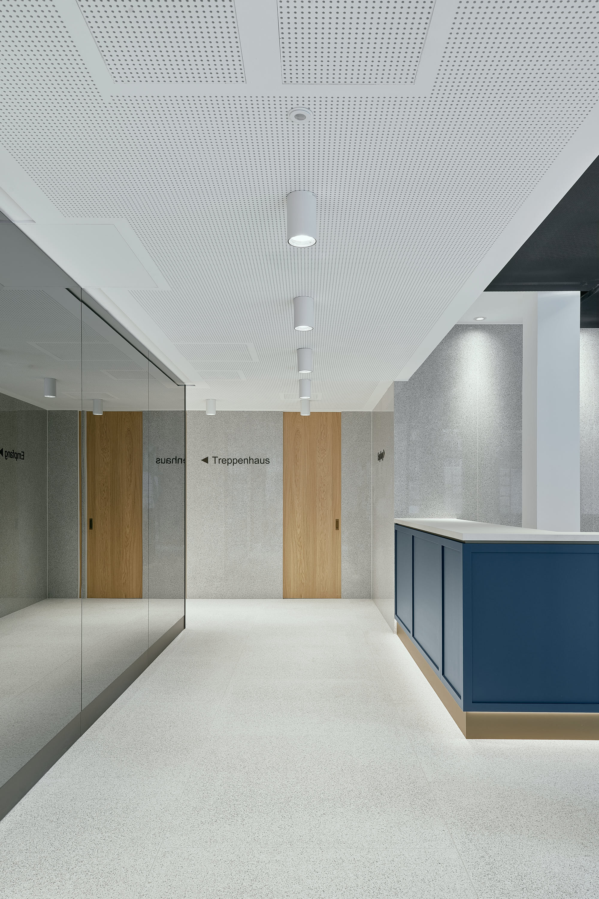 Ein zentral gelegener, hochwertig gestalteter Treppen- und Aufzugskern erschließt das Gebäude und verbindet alle Ebenen über zwei Personenaufzüge sowie eine offen geführte Treppe. Die Technikflächen sind im ersten Untergeschoss untergebracht; die beiden darunterliegenden Tiefgaragenebenen werden über einen PKW-Aufzug erschlossen.