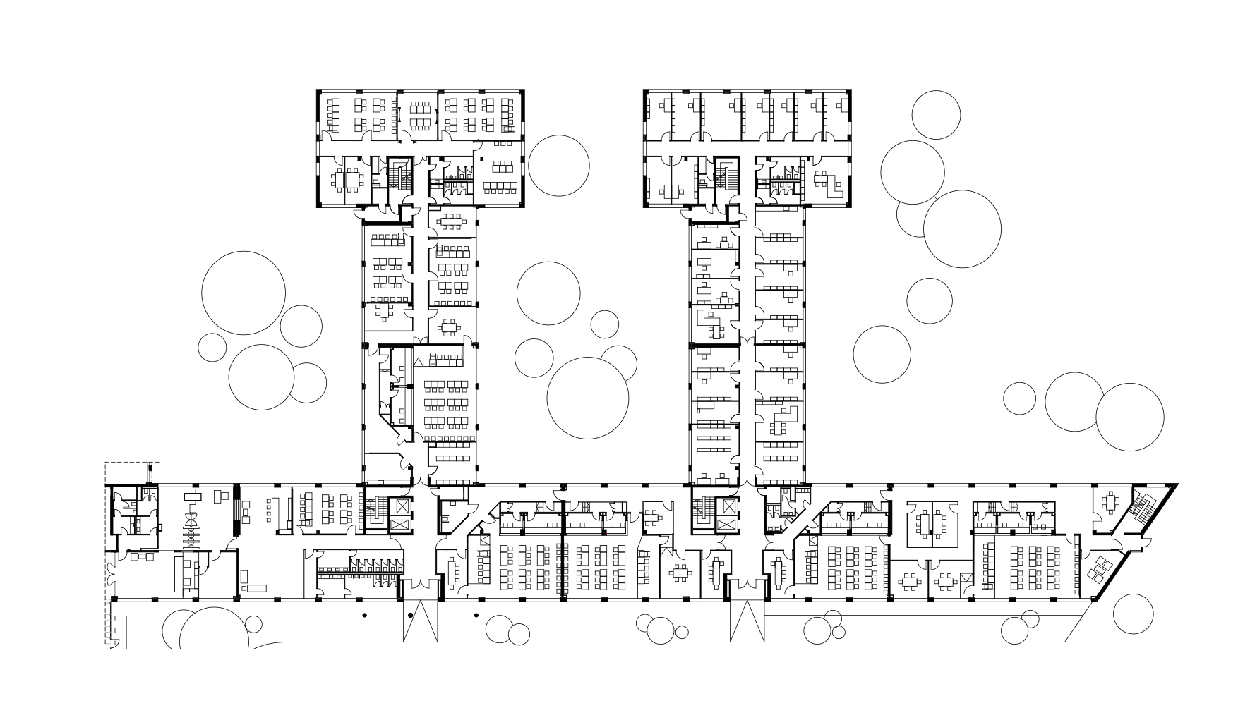 Im Erdgeschoss sind die insgesamt zehn Verhandlungssäle mit spezieller Kommunikationstechnik und Dolmetscherkabinen untergebracht. Zudem gibt es verschiedene Besprechungsräume, Parteibereiche und einen separaten Bereich für die Verwaltung. Die Beschwerdekammern sind in den beiden Obergeschossen angeordnet und der Präsidentenbereich bekommt im zweiten Obergeschoss einen separaten Flügel zugeordnet.