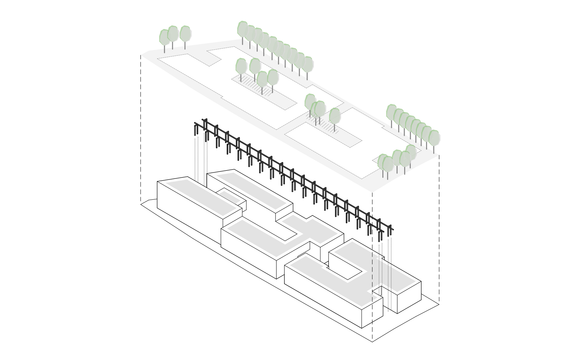 Für den Transformationsprozess hin zu einem hochwertigen, außergewöhnlichen Gestaltungs- und Nutzungskonzept, schlagen wir eine prägnante Fassadengestaltung vor. Die Fassade greift Gestaltungselemente des unmittelbar benachbarten Olympia-Einkaufszentrums und der Pressestadt auf. Sichtbeton, auskragende Bodenplatten und eine symmetrische Arkadenreihe entlang der Magistrale bilden die Hauptelemente der Fassade.