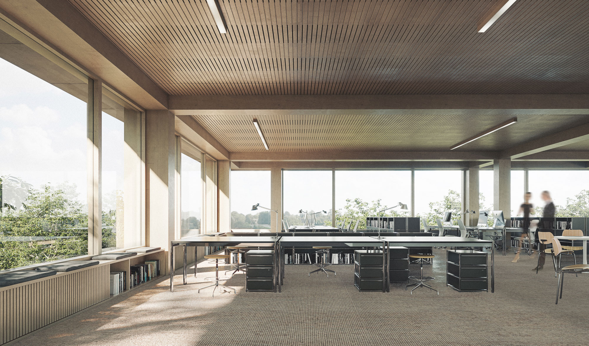 Daher wird das Gebäude als Holzhybridbau konzipiert, einer hochtechnologischen Bauweise mit großem Vorfertigungsgrad und guter Ökobilanz. Die innovative Architektur wird so zum Identitätsanker und bringt ihren Anspruch an Nachhaltigkeit, Klarheit und Effizienz zum Ausdruck.