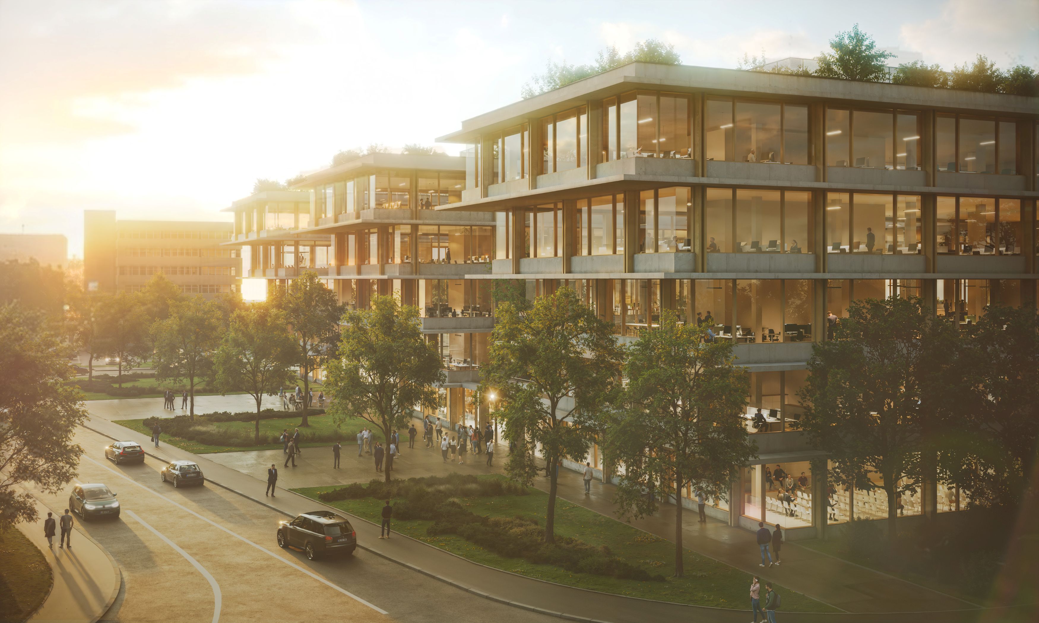 Der Entwurf sieht eine klare Riegelstruktur mit drei identischen Baukörpern vor, die durch zwei zentrale Gebäude verbunden werden. Diese Anordnung ermöglicht effiziente Grundrisse und kurze Wege, während die lichten Geschosshöhen von 4,2 Metern eine hohe technische und räumlich Anpassungsfähigkeit gewährleisten. Das Erdgeschoss wird als zusammenhängende, großzügige Zone ausgebildet, die sich für gemeinschaftliche und repräsentative Nutzungen wie Empfang, Showroom oder Gastronomie eignet.