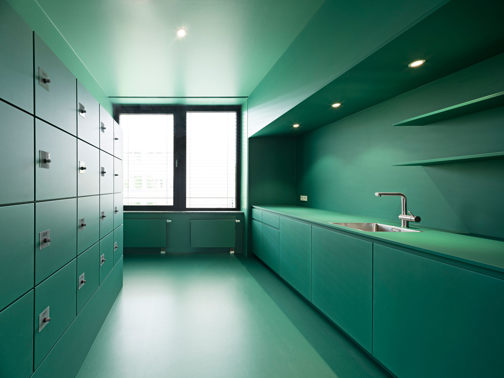 Die halbrunde Form des Gebäudeteils gibt die Grundstruktur des Entwurfes vor. Das Herz der Kantine, die Ausgabestation, befindet sich im Zentrum des Halbkreises. Die Deckengestaltung, das Beleuchtungskonzept und die Möblierung sind radial um diesen Mittelpunkt angeordnet. Helles Holz, schwarzes Metall, graues Epoxidharz, lasierte Fliesen und auffällige Leuchten lassen die „Micro Kantine“ in neuem Glanz erstrahlen.