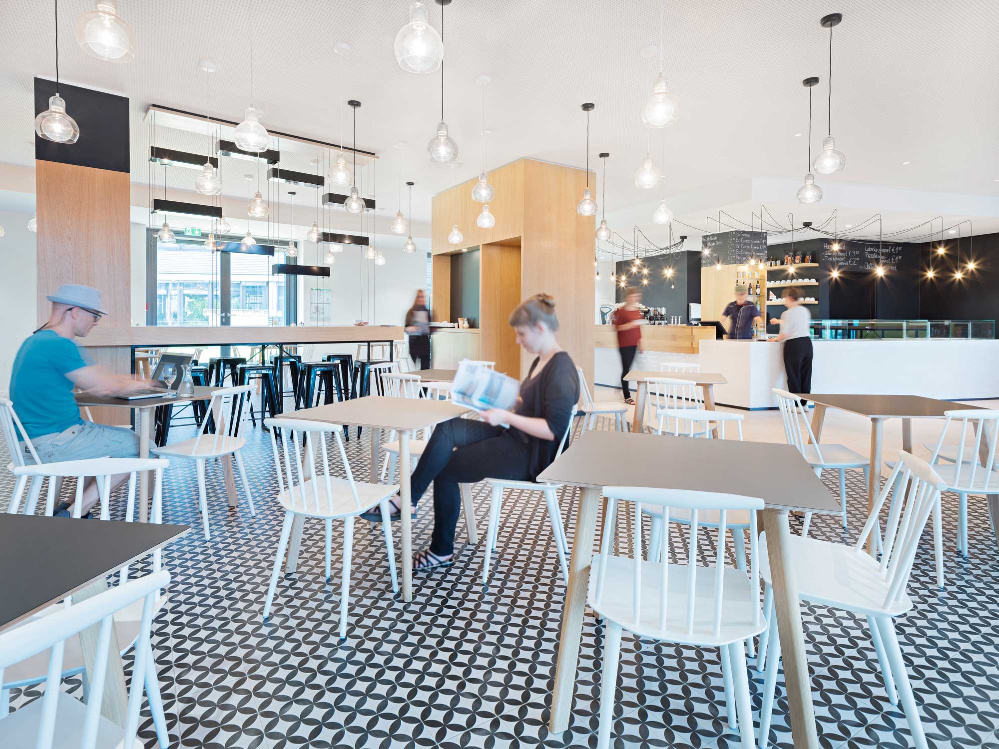 Als Bestandteil der Revitalisierung des ehemaligen Microsoft Standortes, wurde auch die Mitarbeiterkantine umgestaltet. Neben der anspruchsvollen Innenarchitektur im skandinavischen Stil, ist vor allem die Neustrukturierung in Gastraum, Bistro und Kaffeebar strukturgebend.