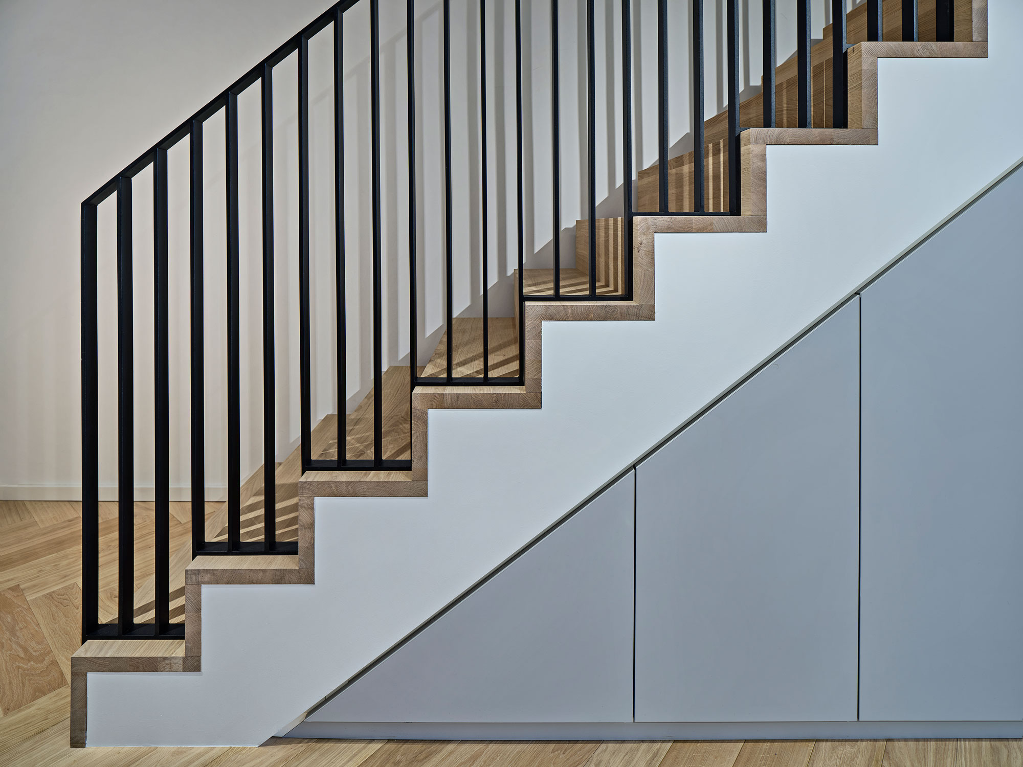 Die neu gestaltete Treppe bildet das verbindende Element aus Holz und Stahl über alle Etagen. Ein besonderes Augenmerk wurde auf die Lichtplanung gelegt, um die Räume in Szene zu setzen und eine einladende und angenehme Atmosphäre zu kreieren.