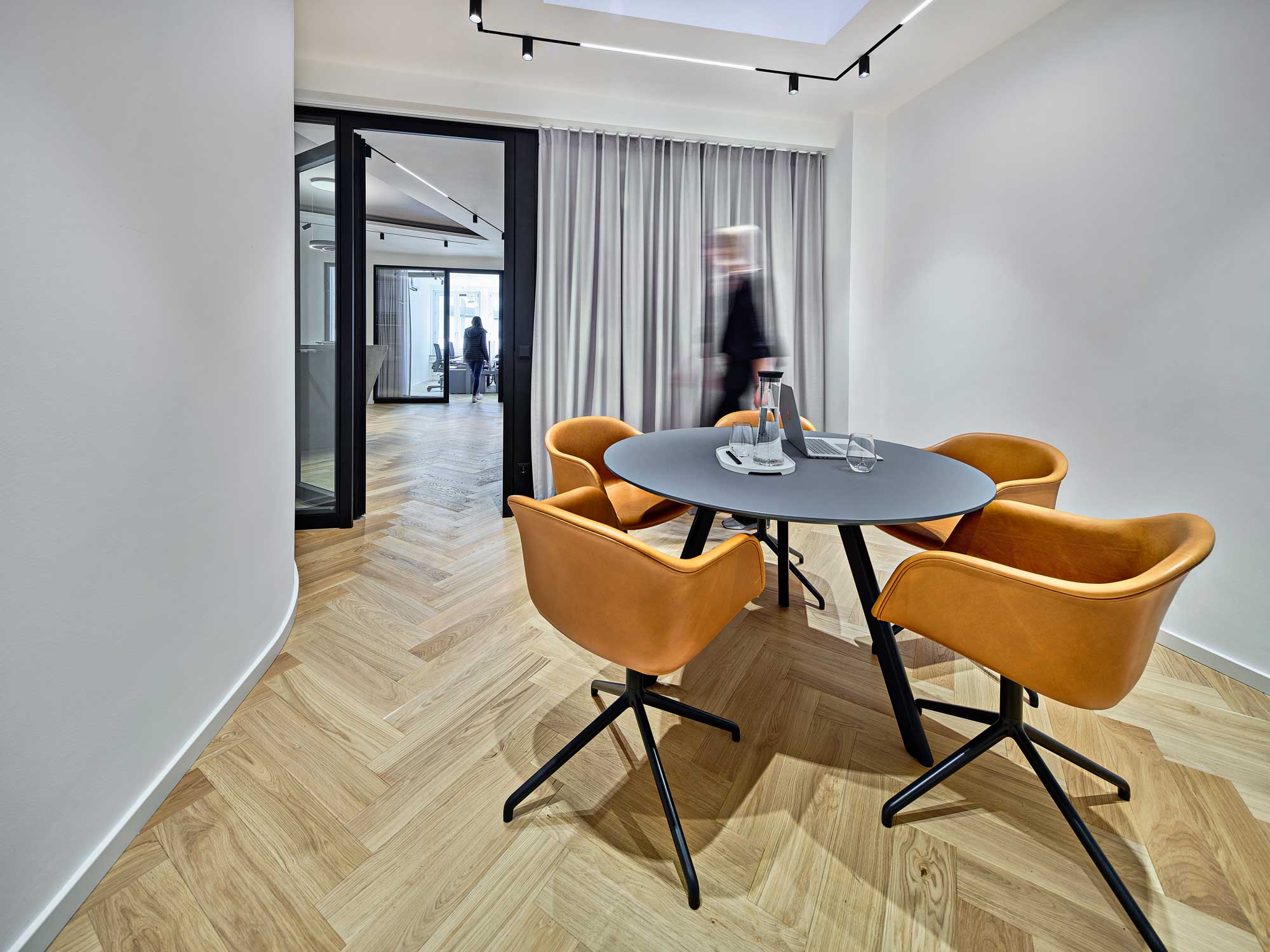 Die geschlossenen Wände der außenliegenden Büroräume wurden durch Glas-Trennwände ersetzt, um mehr Offenheit zu schaffen. Dadurch wird die neue Mittelzone zusätzlich mit natürlichem Licht erhellt und eine bisher nicht dagewesene Aufenthaltsqualität geschaffen. Bei Bedarf sorgen Vorhänge für Privatsphäre innerhalb der Büros.