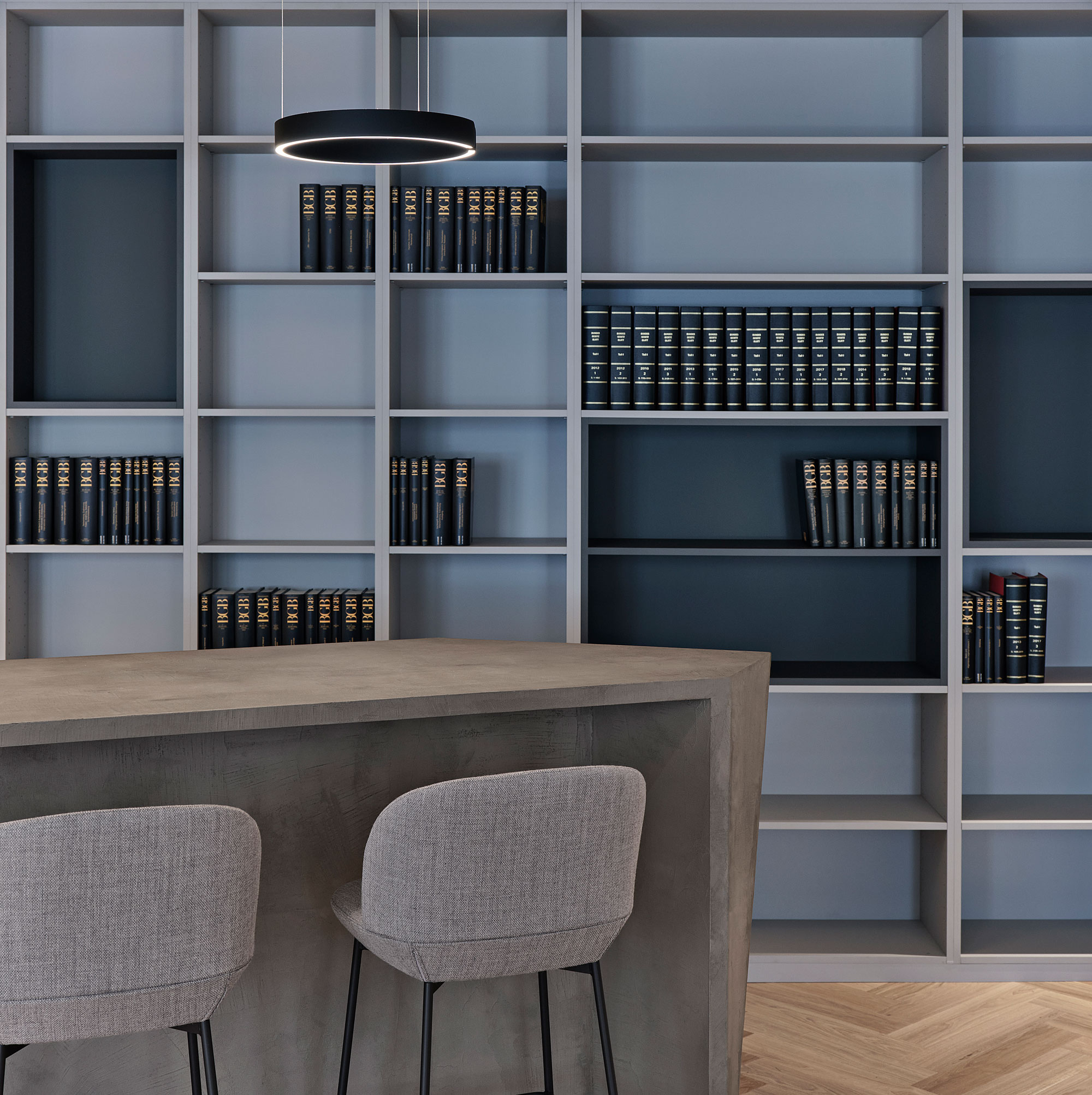 Die Formsprache und das Farbkonzept ergeben ein repräsentatives und modernes Gesamtbild. Stilprägend sind dabei die polygonalen Formen, die sich in der monolithischen Bar, in der Decke und im großformatigen Fischgrätparkett wiederholen.