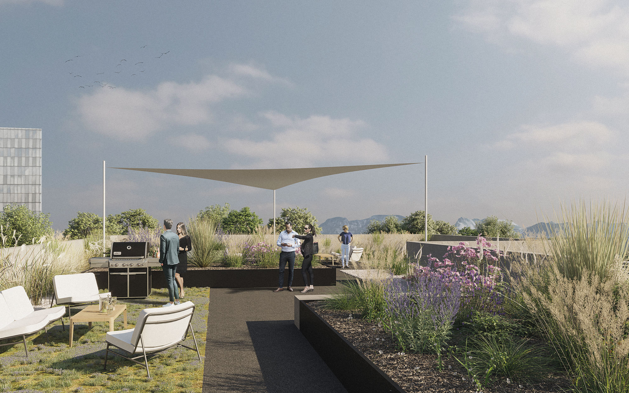 Terrassen mit insgesamt über 800m² und einer außergewöhnlichen Landschaftsarchitektur, im vierten Obergeschoss und auf dem Dach, sind ein echter Mehrwert für alle zukünftigen Nutzer.