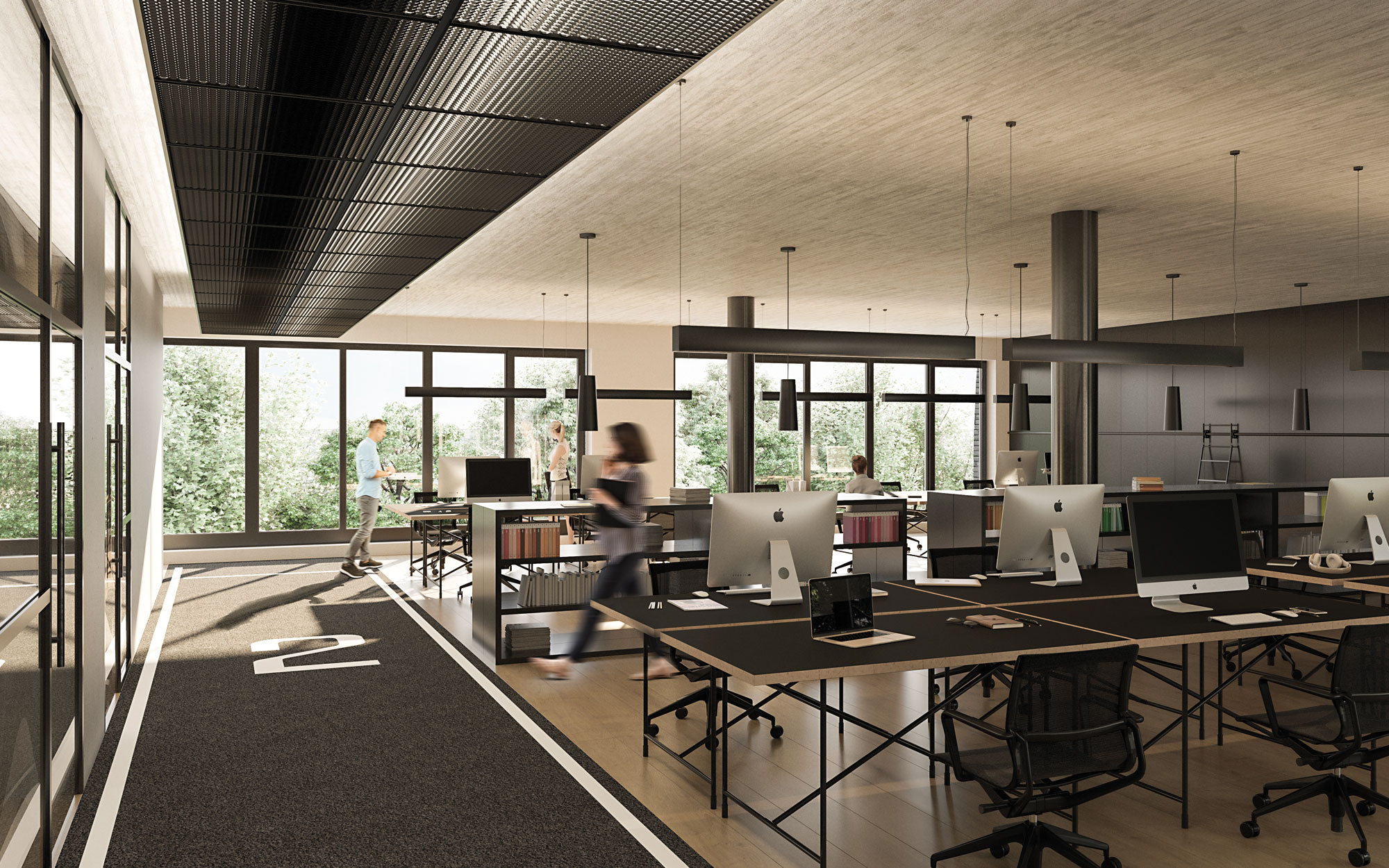 Aufgrund der ungewöhnlichen Grundstückssituation ist auch die gesamte Westfassade als geschlossene Brandwand ausgebildet. Deswegen sind die Büroetagen durch eine symmetrische Anordnung von Büroflächen nach Osten und Funktionsflächen nach Westen geprägt. Durch diese Struktur entstehen 100m lange Räume, welche durch ihre Klarheit in der Aufteilung und Schlichtheit der Materialien bestechen.