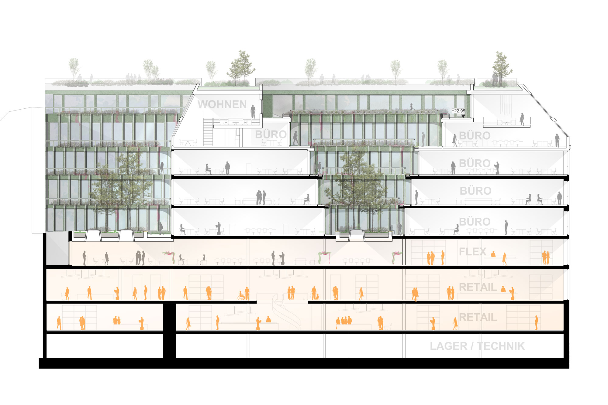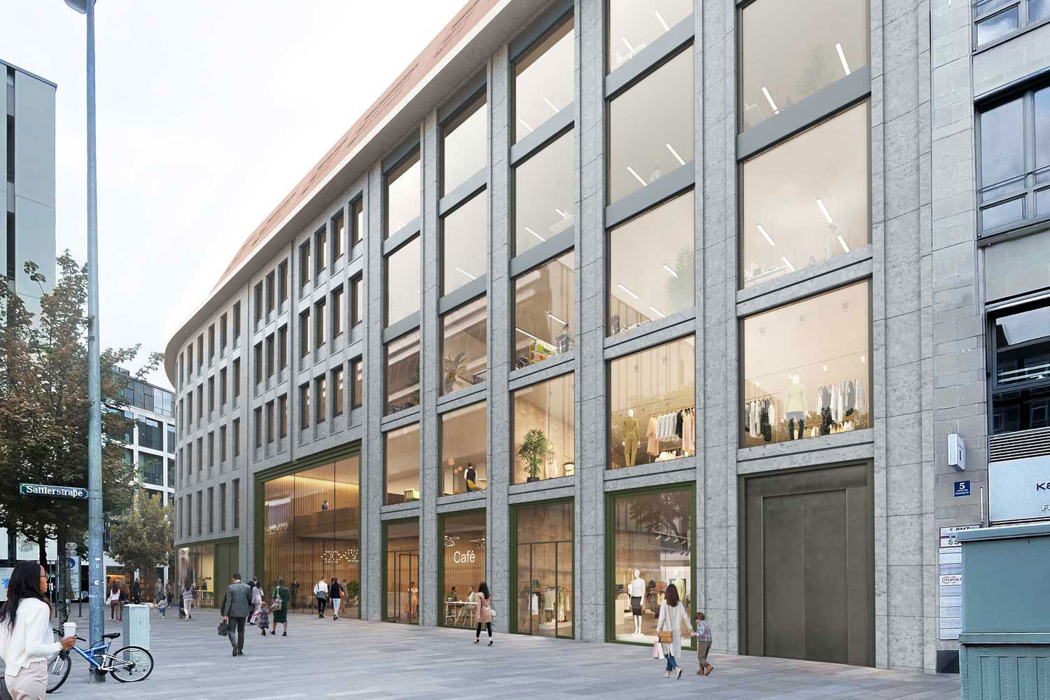 With more than 15,000 passers-by per hour, Kaufingerstrasse in Munich is the busiest shopping street in Germany. The aim of revitalizing the department store in Munich's city center is to upgrade the existing building in an ecologically and economically sustainable manner, utilizing the maximum building rights.