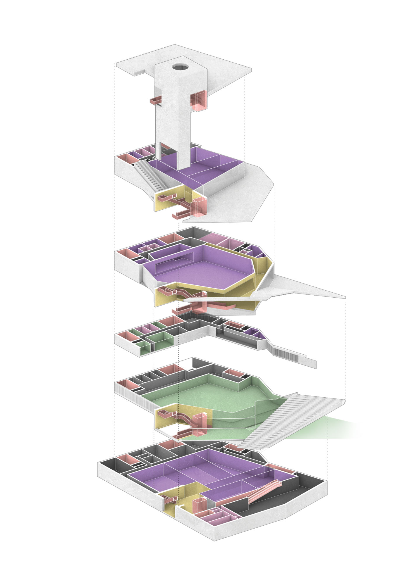 The building houses a market hall, retail, cultural center and event space. Flexible configurations on the first floor and a continuous central circulation system create urban synergies.