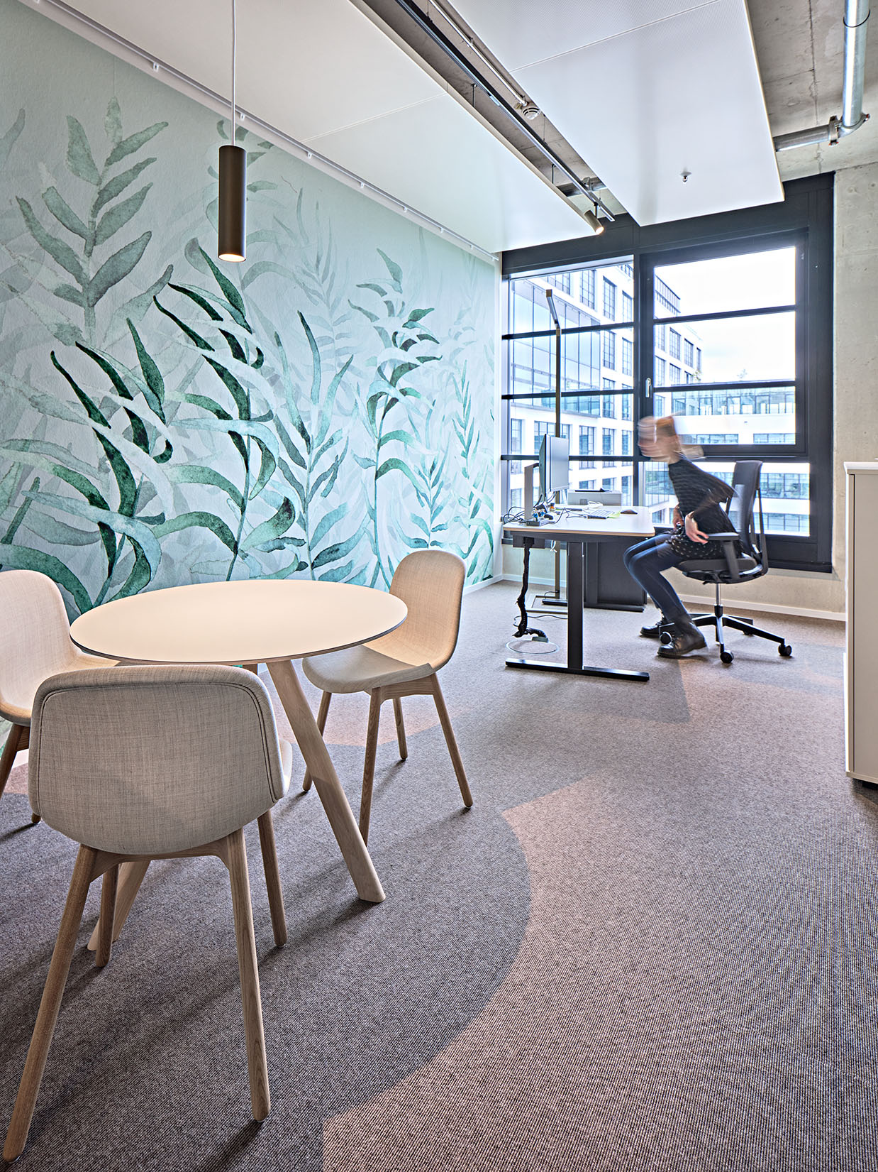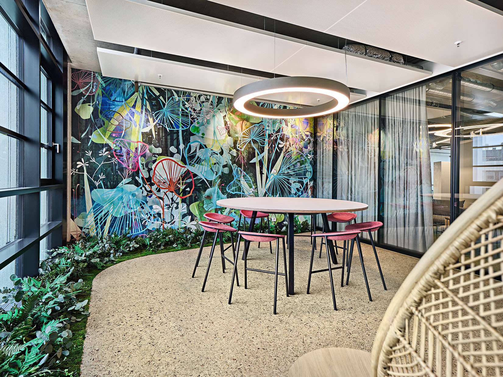 Wood, cork, hay, wool fabrics and sisal, as well as other natural materials, plants and a color concept designed for the respective theme characterize the interior design and thus promote the creativity and well-being of the employees.