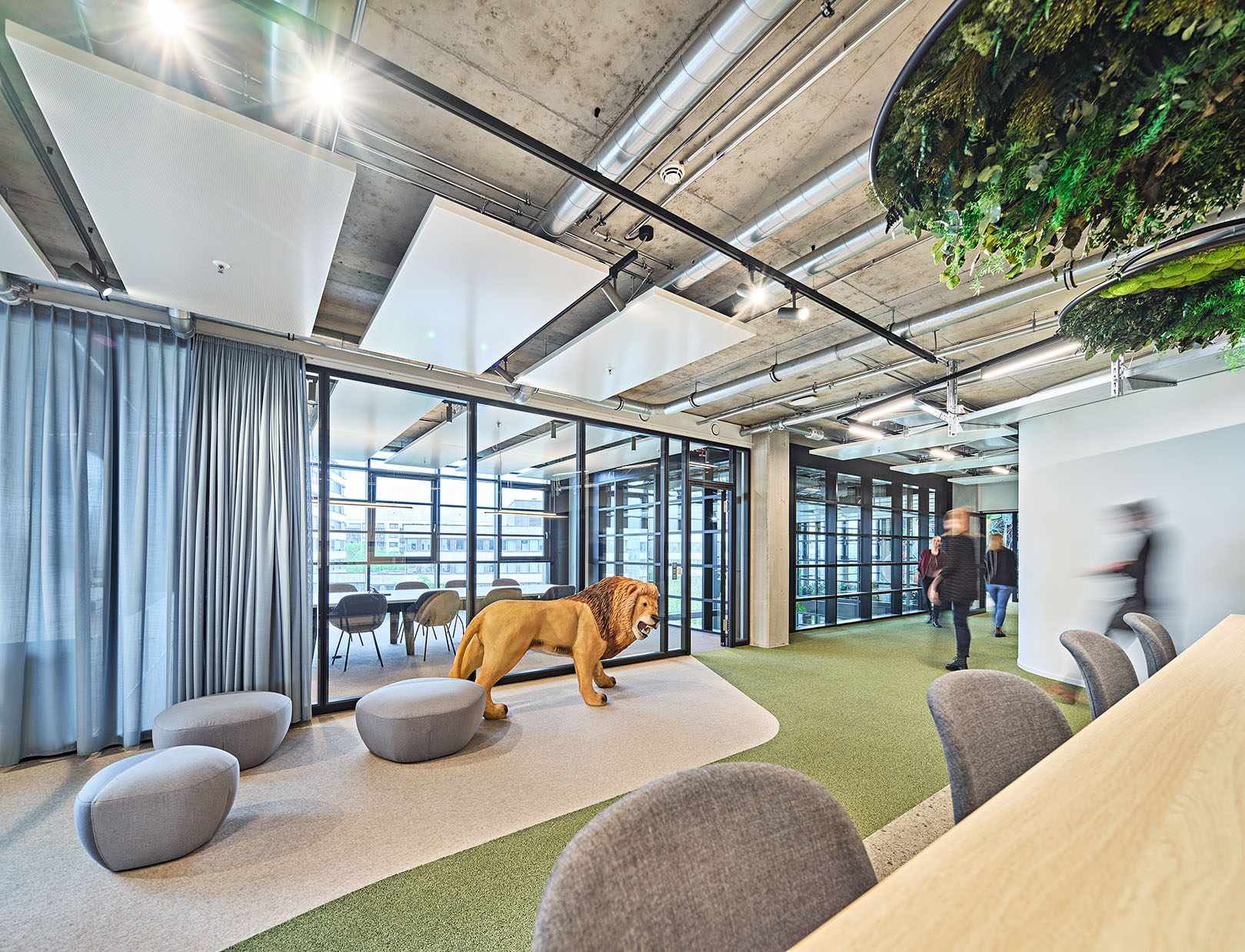 The open work areas and alternating workstations are characterized by light colors. Low furniture, earth tones and textiles dominate the open space areas and characterize them, among other things, by the bushy planting and modern workstations. A life-size Schleich lion is the highlight of the savannah area.