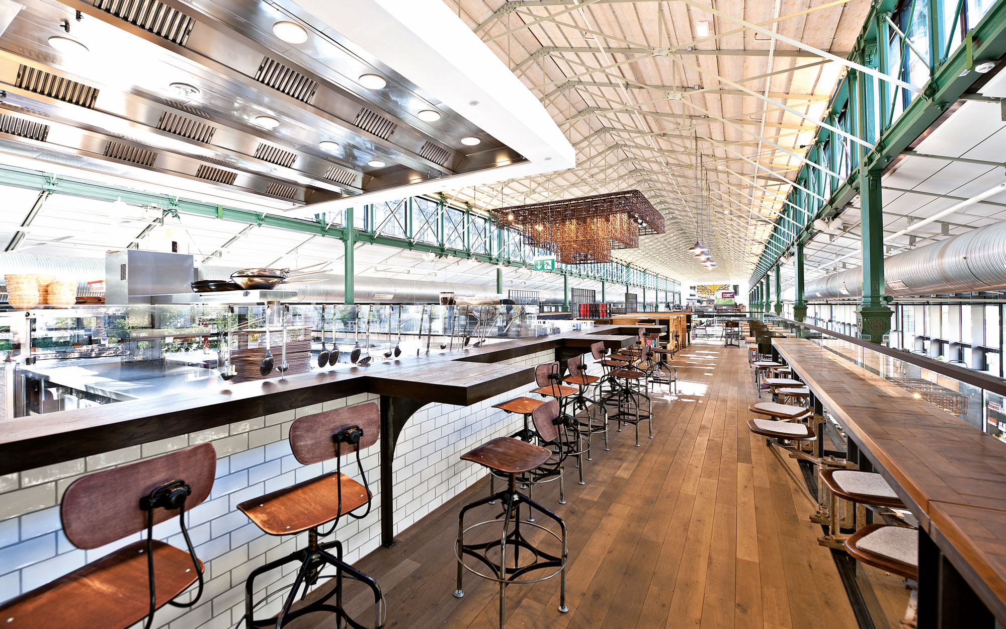 Optische Lichtpunkte entstehen durch die Verwendung weißer Fliesen an den Marktständen, von denen sich die einheitlich dunklen Schieferlacktafeln für Preis- und Produktinformationen abheben.