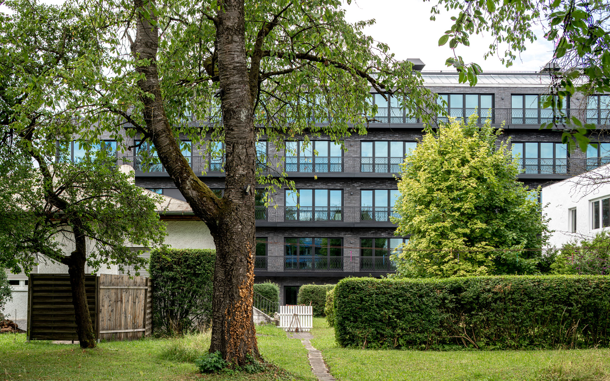The elegant facade plays with a black on black effect of clinker and metal. The contrast of the massive materiality and the large window areas with the filigree balcony construction enlivens the facade and sets it apart from the classically gridded office facades. The ornamentation of the balcony parapets creates an exciting interplay depending on the perspective.