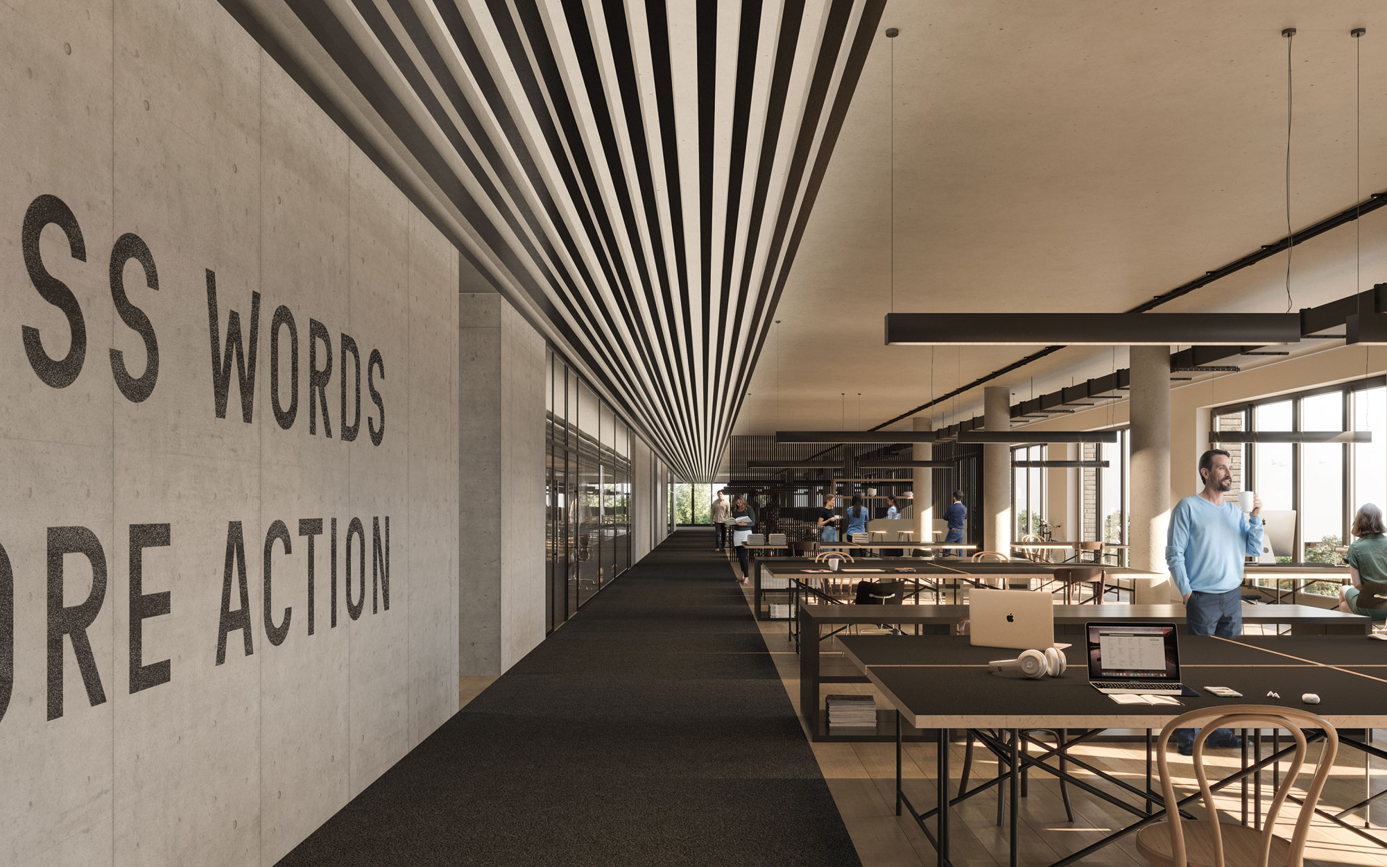Due to the unusual site situation, the entire west facade is also designed as a closed fire wall. Therefore, the office floors are characterized by a symmetrical arrangement of office spaces to the east and functional spaces to the west. This structure creates 100m long rooms, which impress with their clarity of division and simplicity of materials.